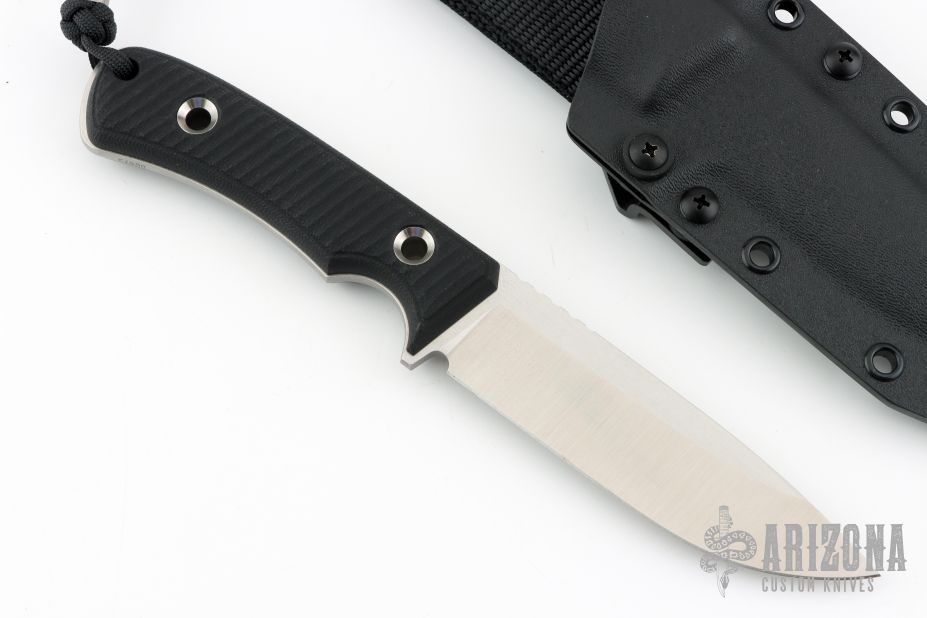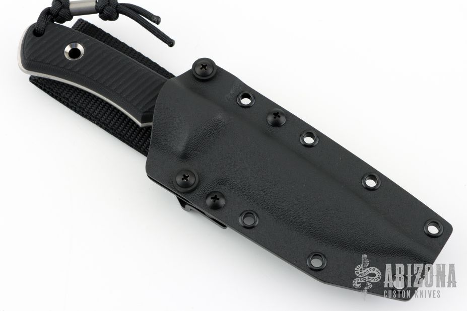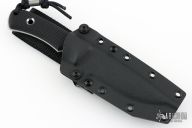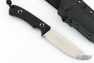 This SouthPole fixed blade from TRC Knives has a satin finished drop point blade with notched thumbrest, .156" blade stock, 1.212" depth. Handle is comprised of milled double black canvas micarta scales with lanyard hole over full tang construction. Includes original box, COA dated 5/15/25, and kydex sheath with belt loop. Excellent condition.