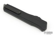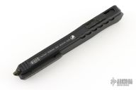 This Cypher OTF is a collaboration between Anthony Marfione and DC Monroe. It features a green standard blade with satin flats and notched thumbrest. The handle has a black anodized aluminum handle with all green hardware and black titanium tip down clip and an green insert at the butt with lanyard hole. Comes with original box and papers. Has some scuffs and minor wear on the clip, otherwise excellent condition. 08/2018 and #0005. Recently serviced and sharpened by Microtech.