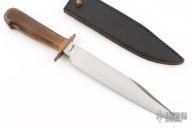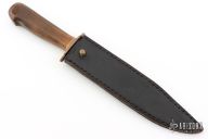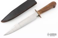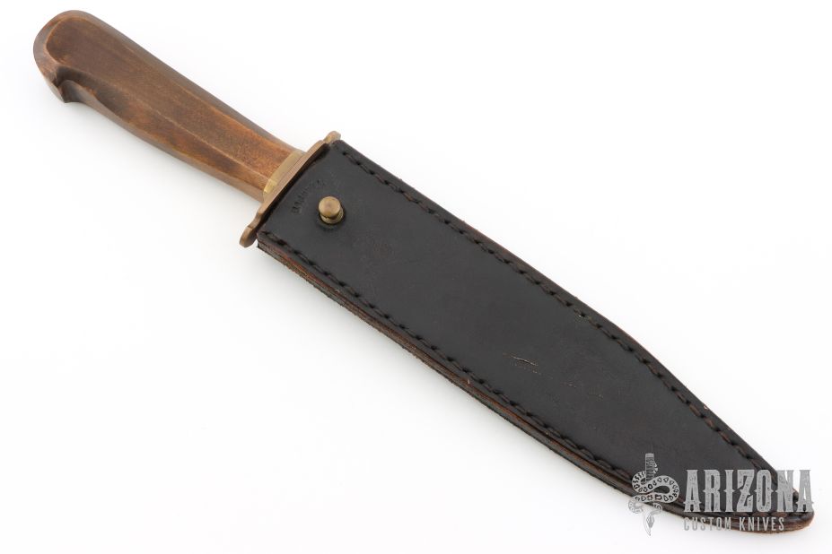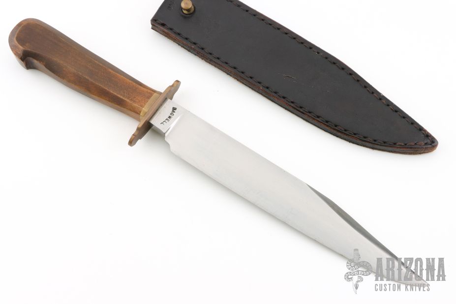 This Bill Bagwell Bowie features a satin finished blade with a sharpened top edge, .349" blade stock and 1.409" blade depth, hidden tang construction. The handle has a brass guard, crow's beak wood handle. Comes with a black leather sheath, zippered case and a letter from the original owner about how and when he got it. Has some scratches, otherwise excellent condition.