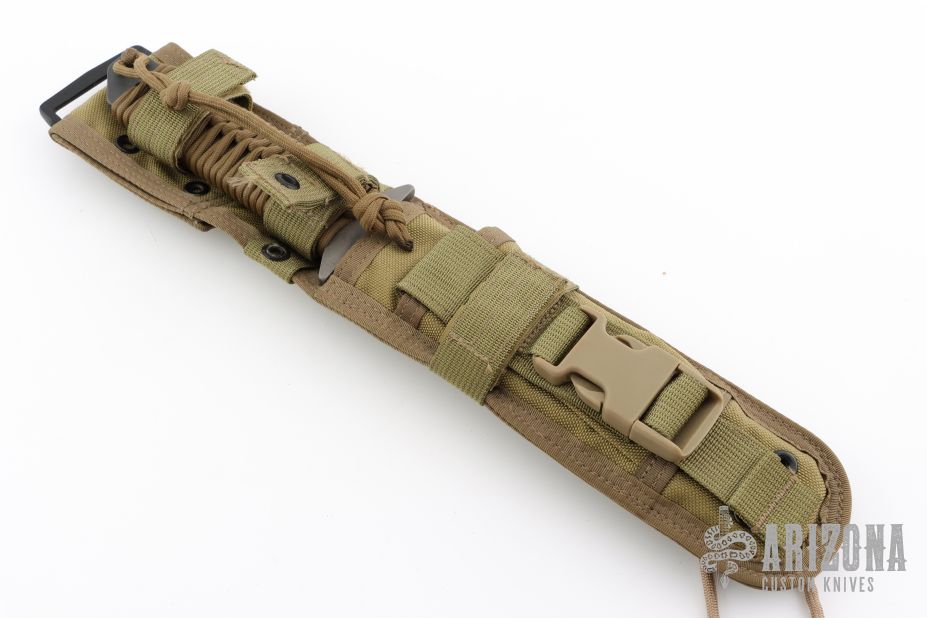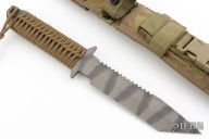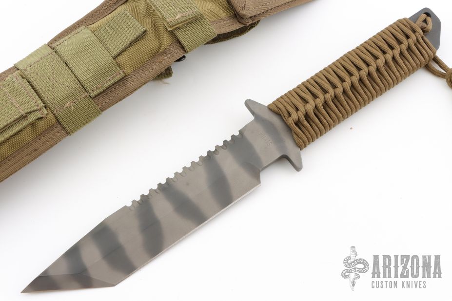 The BN-SS by Strider features a tiger stripe tanto blade with a serrated top edge .252" blade stock and 1.492" blade depth, full tang construction. The handle has a paracord wrapped handle. Comes with a tan nylon sheath. Has a couple light scuffs, otherwise excellent condition.