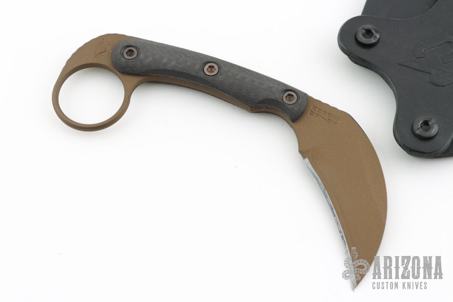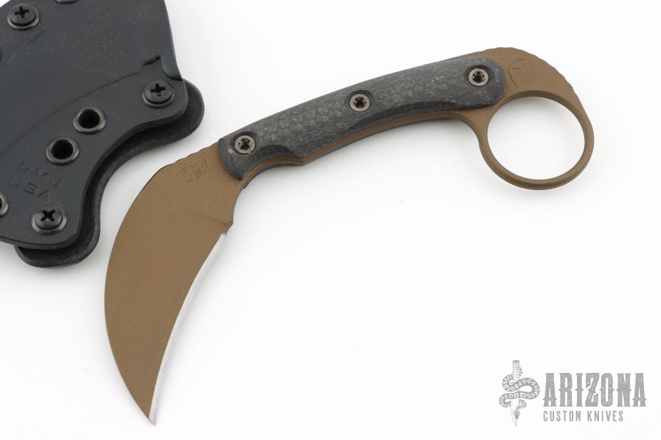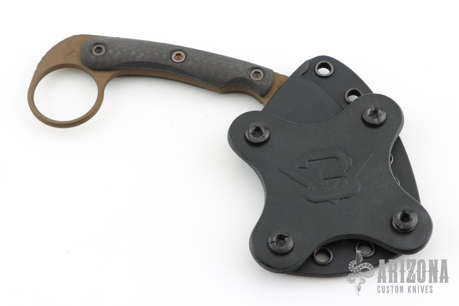 The Korbin is an easy to conceal defensive fixed blade knife. Karambit style knives like the Korbin are great back up blades for those that carry a handgun daily. They are lightweight, deploy quickly and haveno moving parts to fail. They are gross motor skill tools as well, meaning no special skill is required for effective use. The aggressively shaped talon blade on the Korbin is made from 3V steel and features a Burnt Bronze Cerakote finish for wear and glare resistance. The Korbin is designed to work in both reverse and standard grips, and the 1 1/8" finger hole is large enough to fit most finger sizes. The Korbin comes with a molded kydex sheath that includes a two-way belt adapter allowing ambidextrous, vertical and horizontal carry options. The sheath is also compatible with our optional MAD Straps if you would like to carry IWB (Inside Waist Band). You can find the optional MAD Straps on RMJ's website.