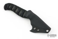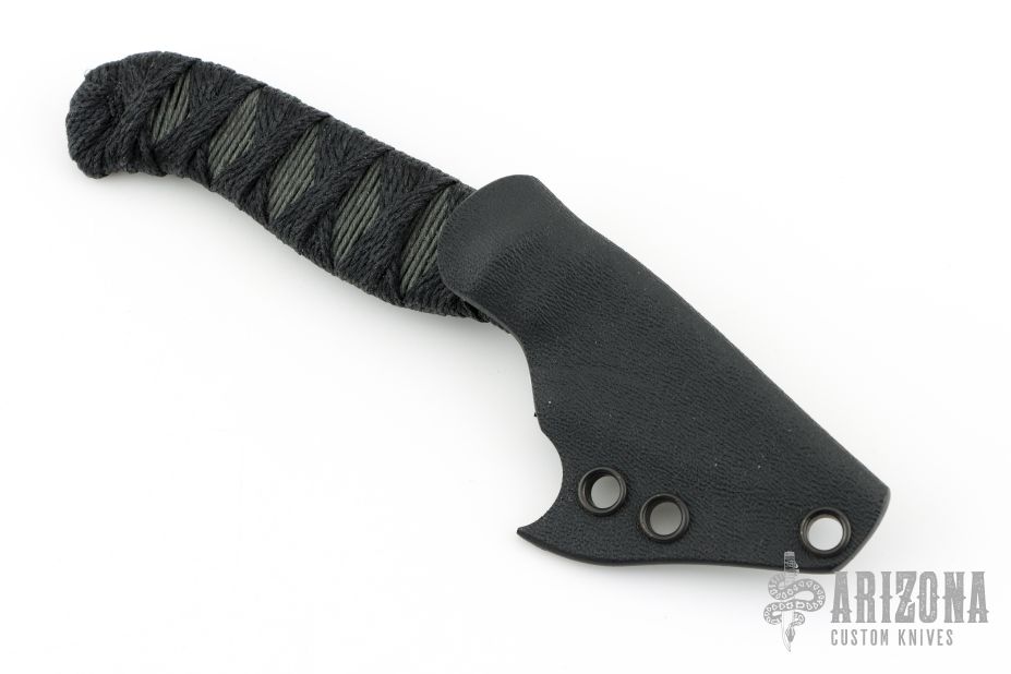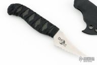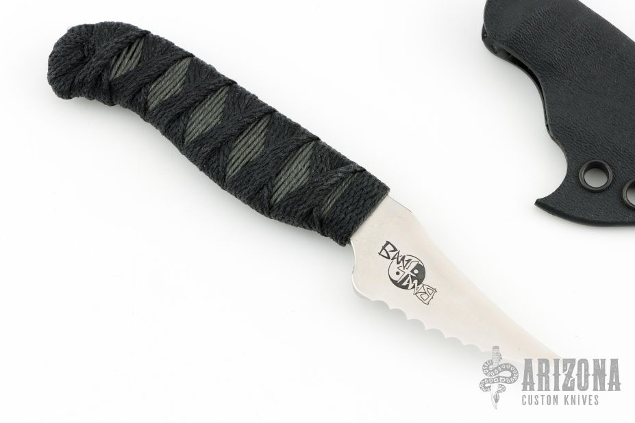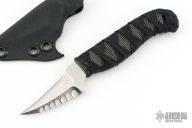 This Pikal from Bantang Knives features a satin finished double edged chisel ground blade with a convex main edge and serrated top edge, .133" blade stock and .963" blade depth, hidden tang construction with black over gray cord wrap. Includes kydex sheath. Excellent condition.