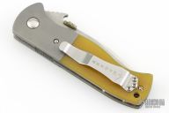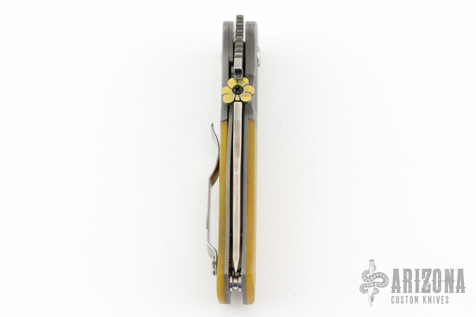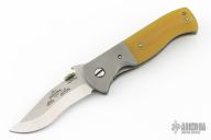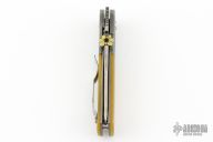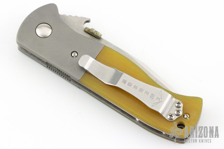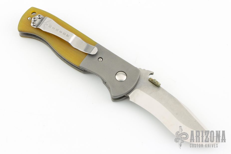 This PoBoy Emerson Comm-Seven was done by Steve Kyle. It features a stonewashed blade with a custom shamrock titanium thumbdisc and wave feature. The handle has bead blasted and dovetailed titanium bolsters, Lager Ale G-10 scales, titanium liners and a tip up stainless steel clip. Comes with original box and black G-10 scales. Has a couple light scuffs, otherwise excellent condition.