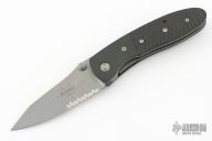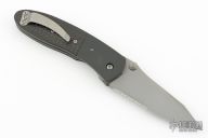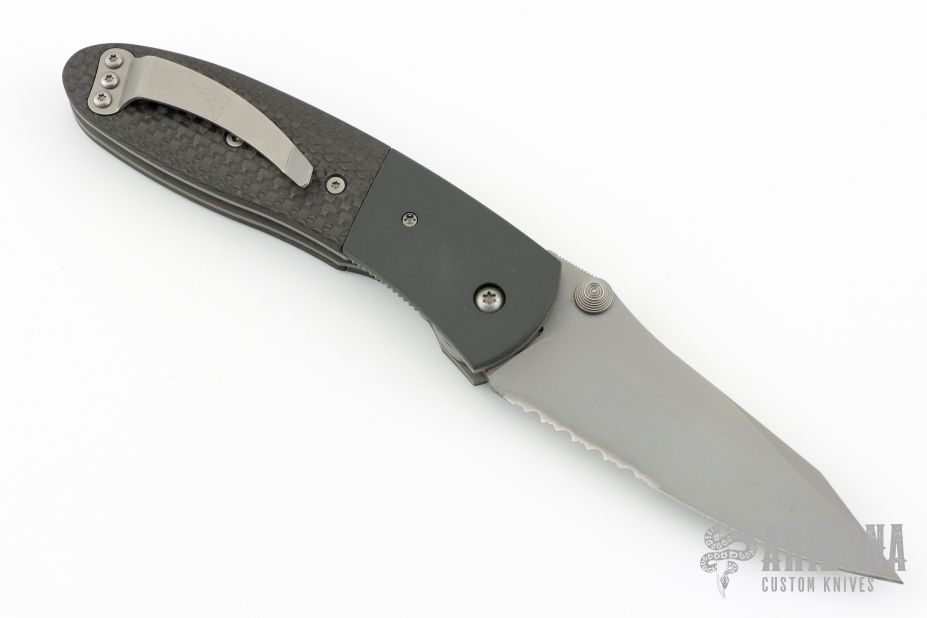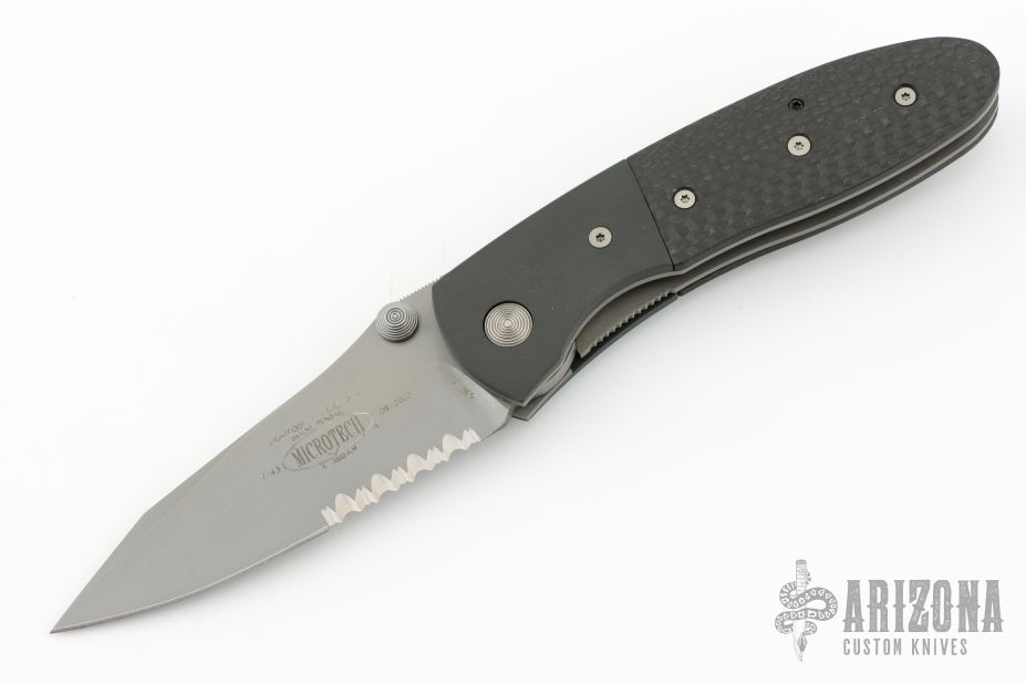 This Lightfoot LCC D/A side opener by Microtech has a bead blasted partially serrated blade, black aluminum bolsters, and carbon fiber scales. Stainless steel clip and liners. Dated 09/2002 and #7743. Comes with original box and papers. Has a couple light scuffs, otherwise excellent condition.