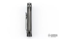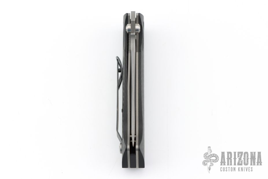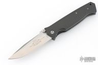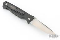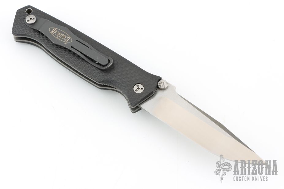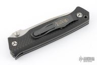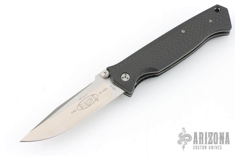This CMTX5-A from Microtech has a satin clip point blade with notched thumbrest and dual thumbstuds. The handle has carbon fiber scales, blasted titanium liners, black backspacer, lanyard hole, and a black coated tip up titanium clip. Side opening leaf-spring automatic. Clip trigger is a Butch Vallotton design. Dated 10/2004 and #0486. Nice detent, lockup, blade seating and action. Excellent condition. Comes with original box, papers and sheath.