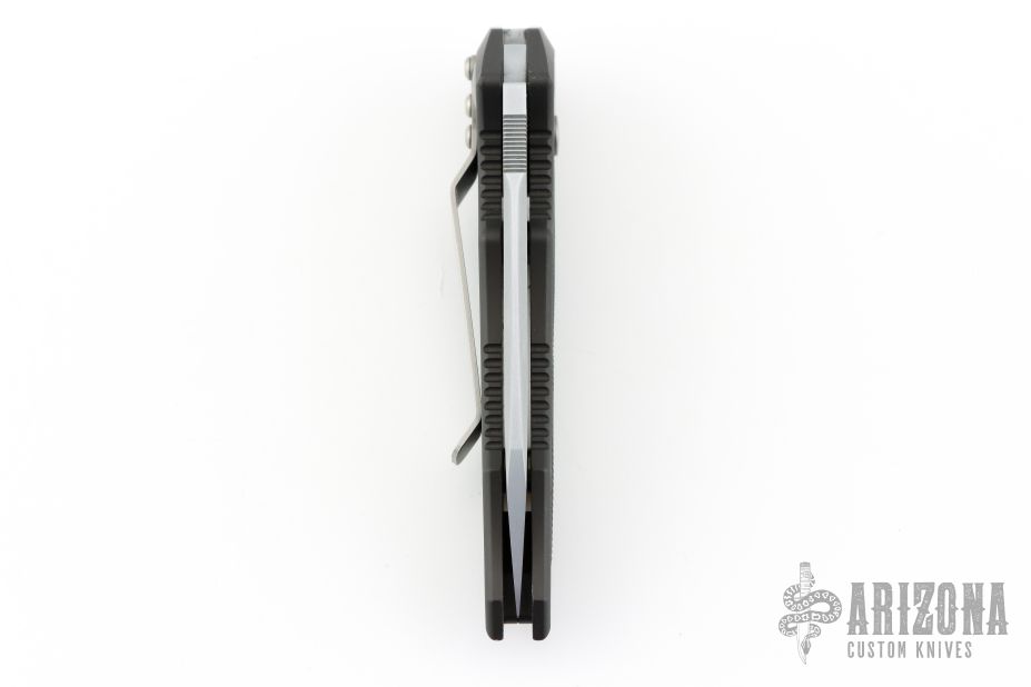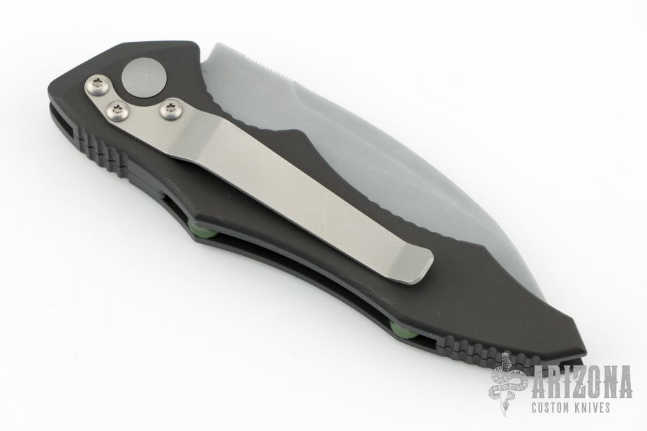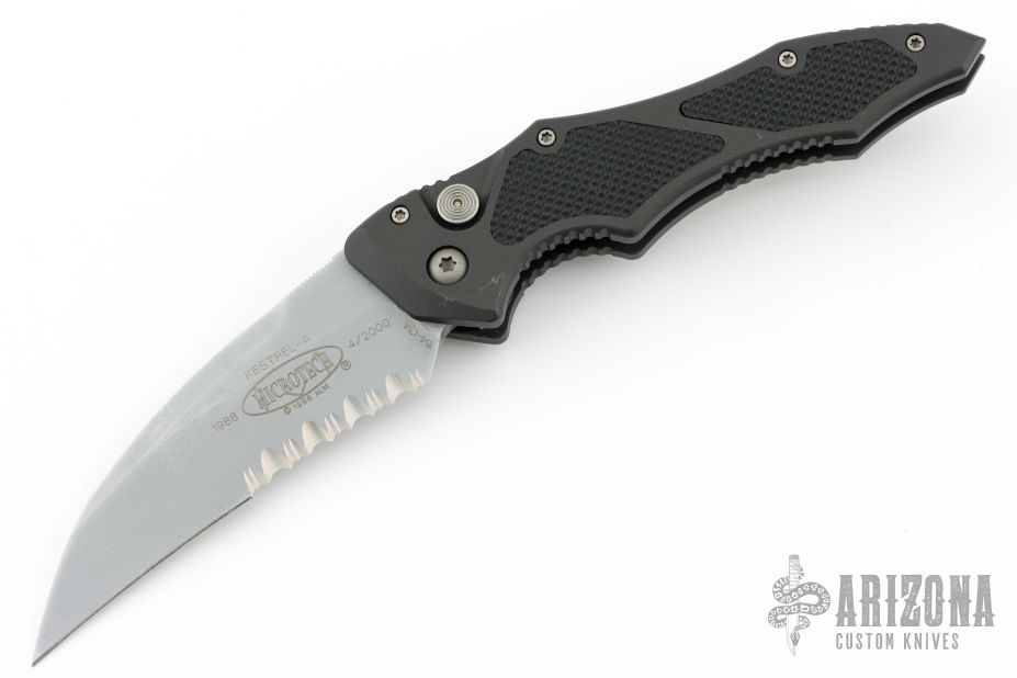 This is an older Kestrel auto with a silver blade with a partially serrated edge and a black aluminum frame with non-slip inlays. Stainless steel clip. Green posts. Dated 4/2000. S/N 1988. Has a couple light scuffs, otherwise excellent condition.