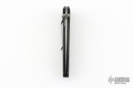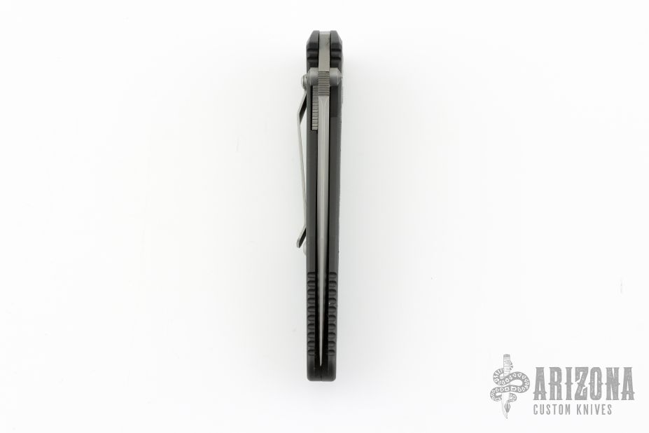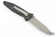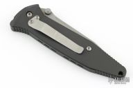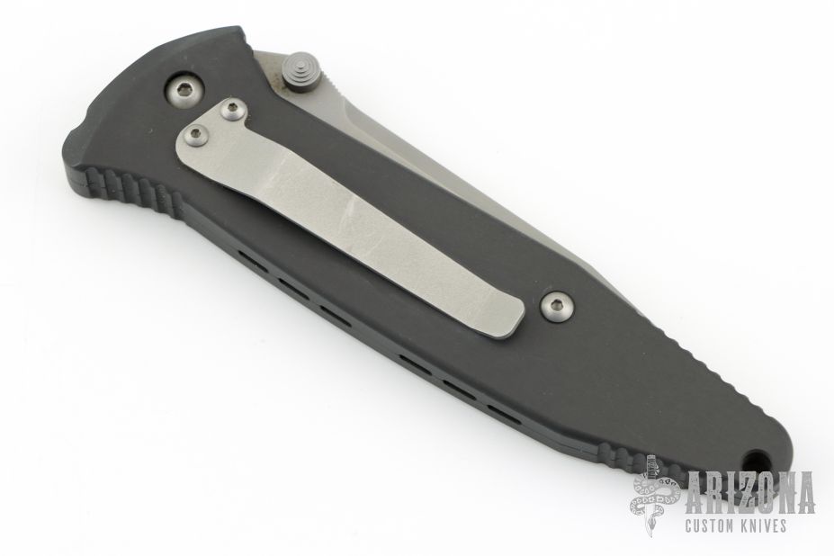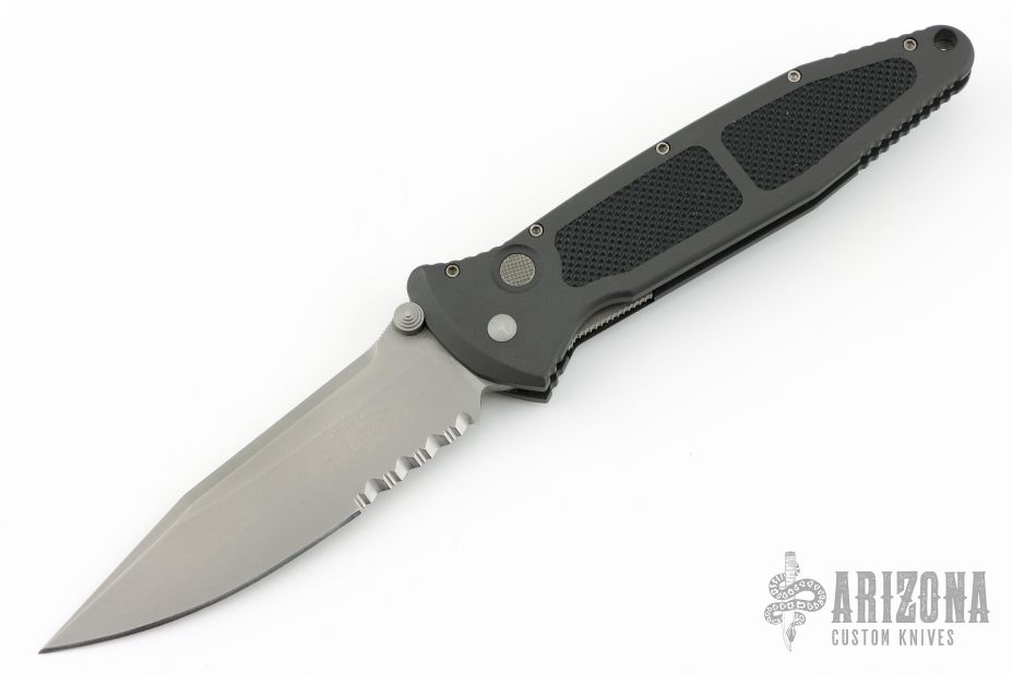 This Socom D/A Auto by Microtech features a bead blasted partially serrated blade with dual thumbstuds and a notched thumbrest.  The handle has a black aluminum frame with non-slip inserts and a tip down stainless steel clip. Dated 1/98. Has a few light scuffs, otherwise excellent condition.