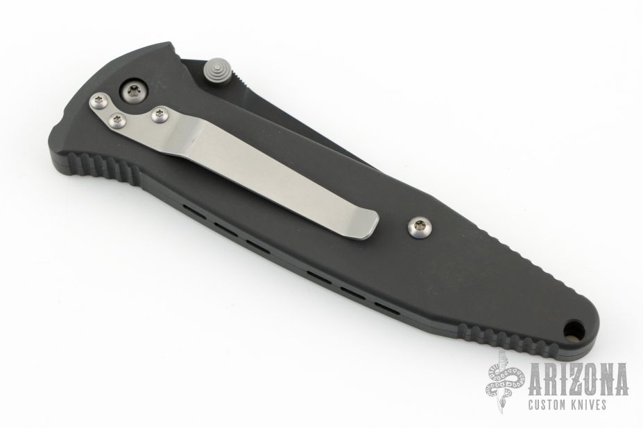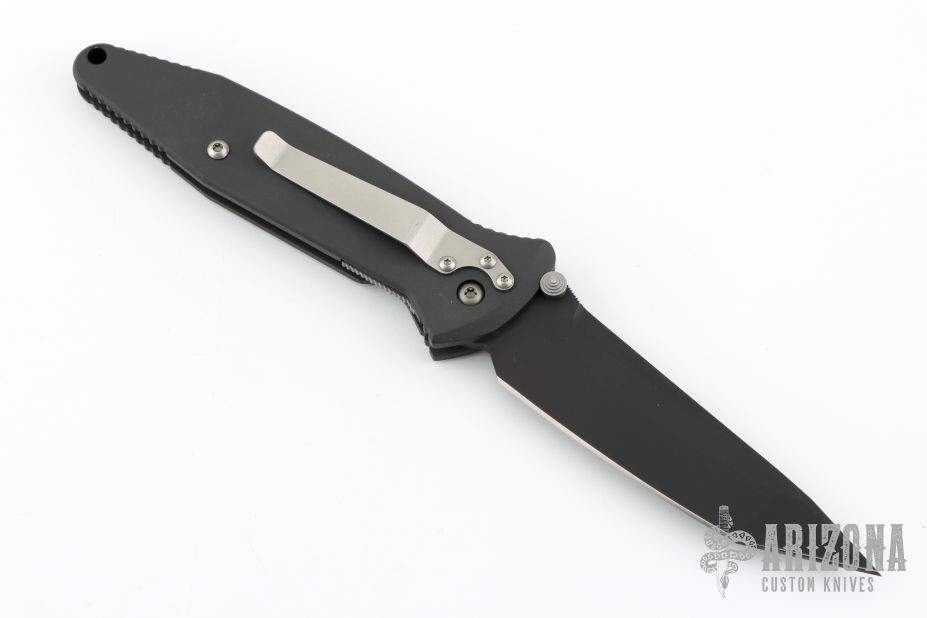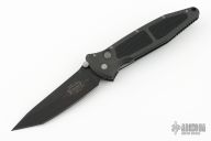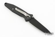 This Socom D/A tactical side-opening automatic by Microtech has a black coated plain edge blade. Dated 5/99. Has a black aluminum handle with rubber inserts, all hardware including clip is bead blasted. Strong action and perfect lockup. Has some light scuffs and scratches, excellent condition otherwise.