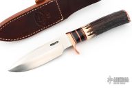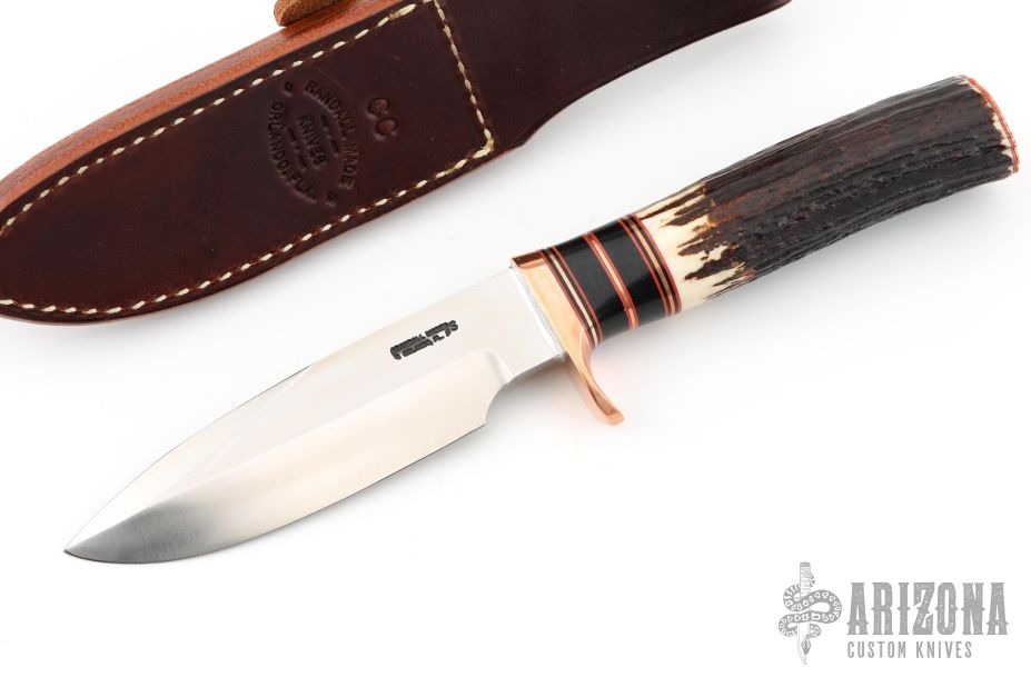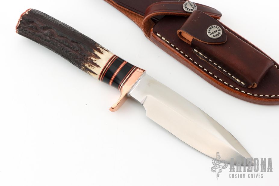 This Copper Companion by Randall Made Knives features a stainless steel blade, .202" blade stock, 1.286" blade depth. 1.5" sharpened top edge and notched thumbrest, hidden tang construction. The handle has a copper guard and butt plate, stag grip and red/black/copper/black linen micarta spacer pattern. Comes with brown leather sheath. Excellent condition.