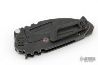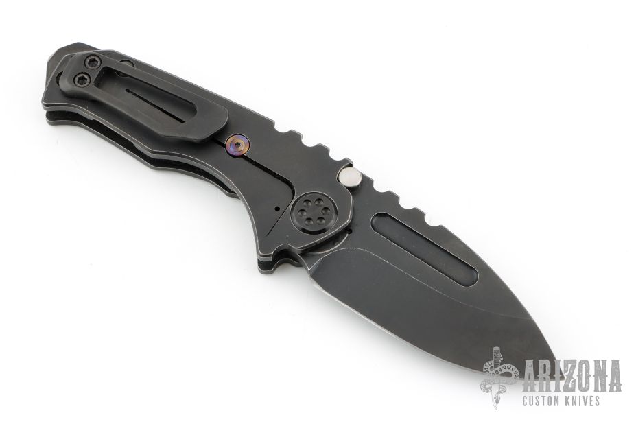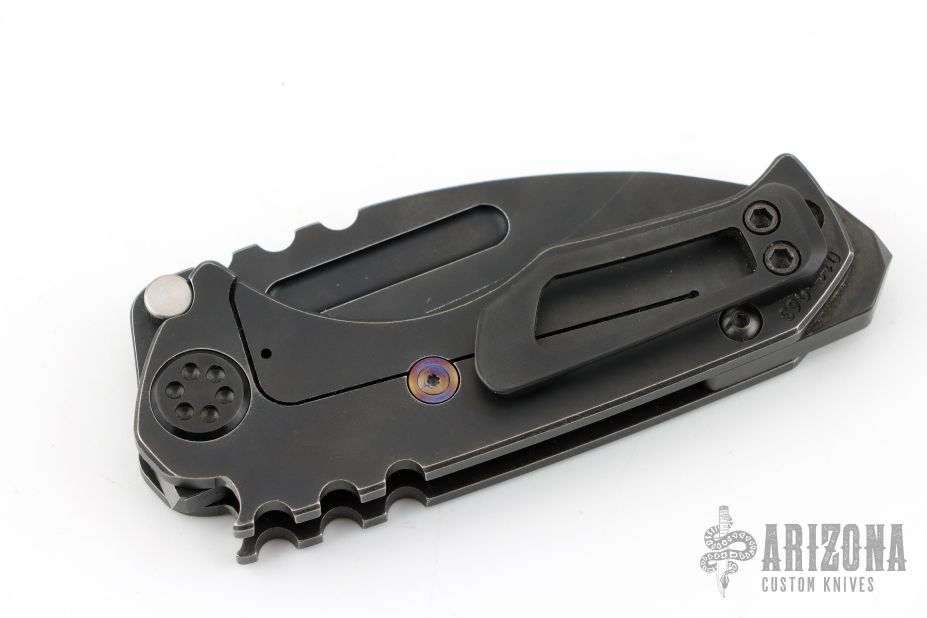 This Micro Praetorian from Medford Knife and Tool features a PVD finished drop point blade with fuller/thumb grooves and notched thumbrest. The handle has a PVD titanium frame over a backspacer/glass breaker, matching tip up pocket clip. Includes original box, hard case and paperwork dated March 11, 2021. Excellent condition.
