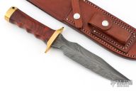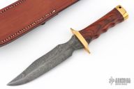 This CISO SOG Bowie by Greg Covington has a feather Damascus (1080, 1084, 15n20, and 8670 steels) blade with a false top edge, .179" blade stock and 1.391" blade depth, hidden tang construction. The handle has a brass guard and butt, cocobolo grip, lanyard hole at the butt. Comes with original brown leather sheath. Excellent condition. Comes with a note from the maker.