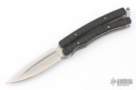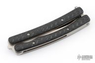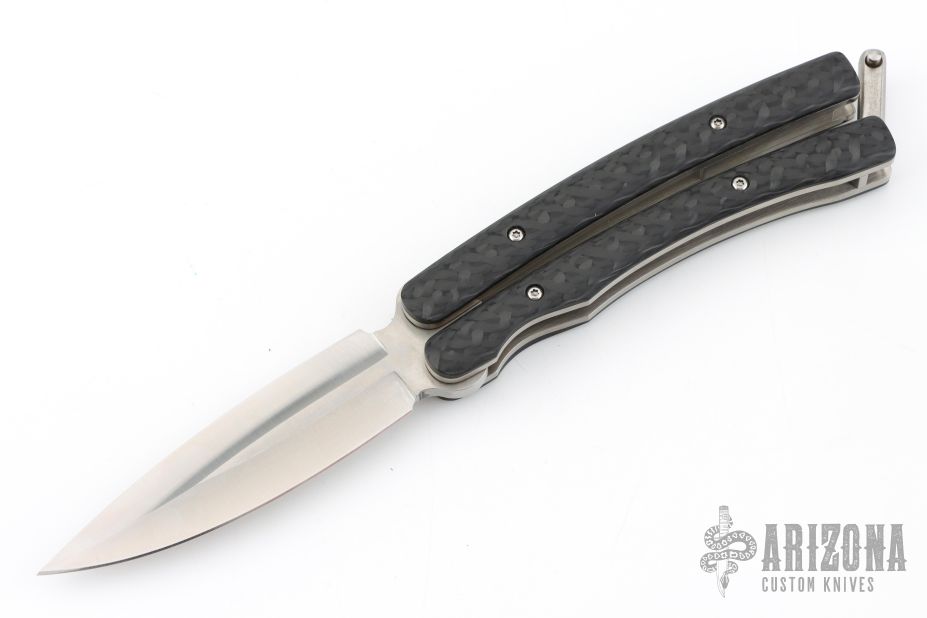 This balisong by Shawn Greacen features a satin finished spear point blade with false top edge. The handle is composed of satin finished titanium liners, carbon fiber covers, and titanium t-latch. Has a couple light scratches, excellent condition otherwise.