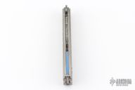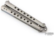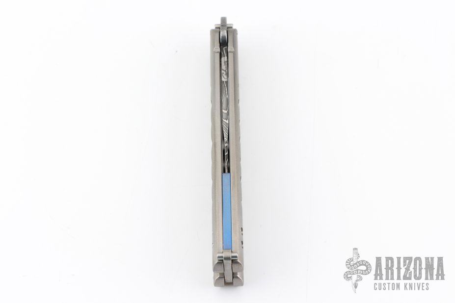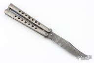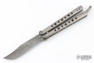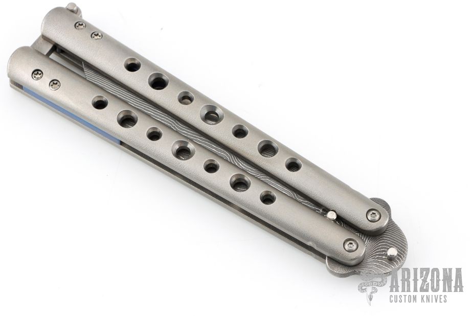 This Balisong by Chuck Gedraitis features a Damascus blade with a false top edge.  The handles are bead blast finished titanium with anodized titanium spacers and bead blasted titanium t-latch. #174 inside the frame. Comes with COA. Excellent condition.