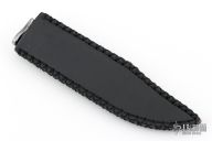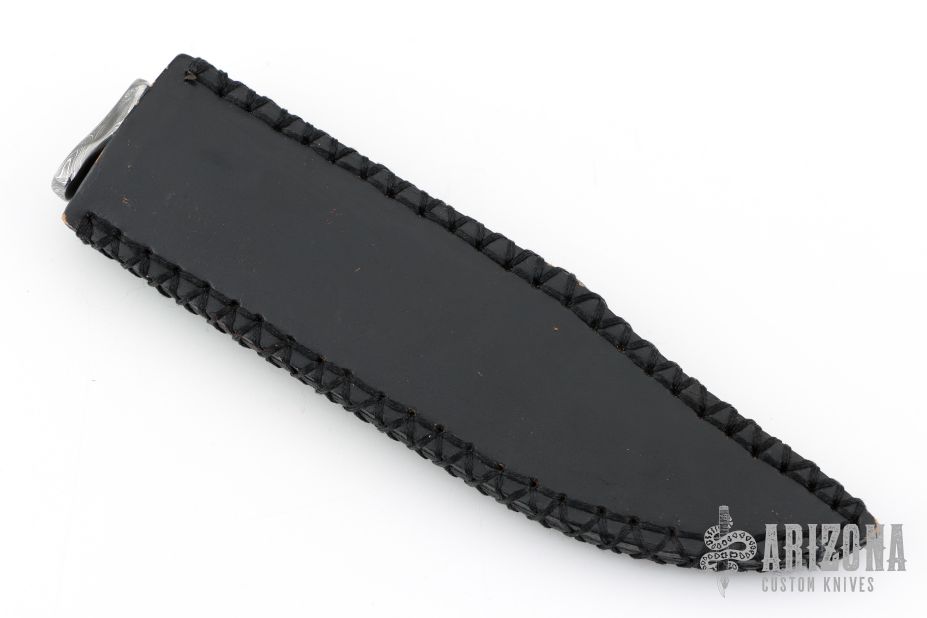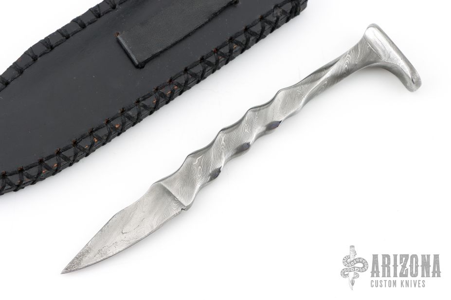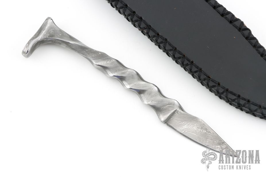 This knife by Master Smith Steve Schwarzer features a Damscus blade with spiral fluted handle, .201" blade stock and .642" blade depth, integral construction. This knife is stamped on the butt with "SCHWARZER". Has a little patina, otherwise excellent condition. Comes with black leather sheath, not original to the knife, but it fits nicely.