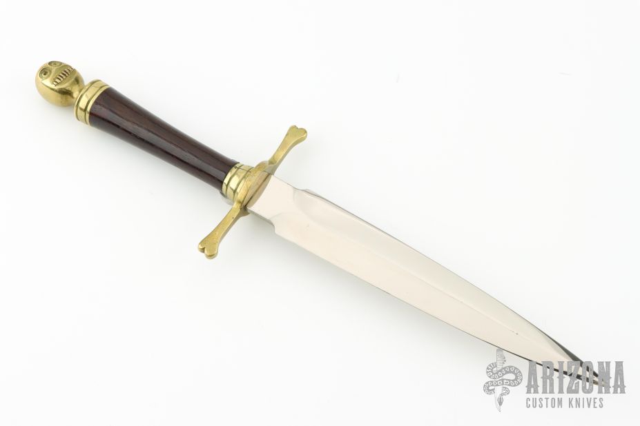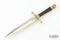 This Dagger by Armando Aragon features a satin finished double edged blade with .183" blade stock and 1.081" blade depth, hidden tang construction. The blade reads "A Aragon e Hijos J.P. Garcia No 15 Oaxaca Oax. Mex" on the ricasso. The handle has a brass guard and butt with a wood grip. Has some very small oxidation spots on the blade, otherwise excellent condition.