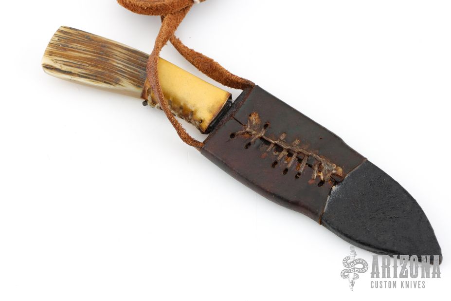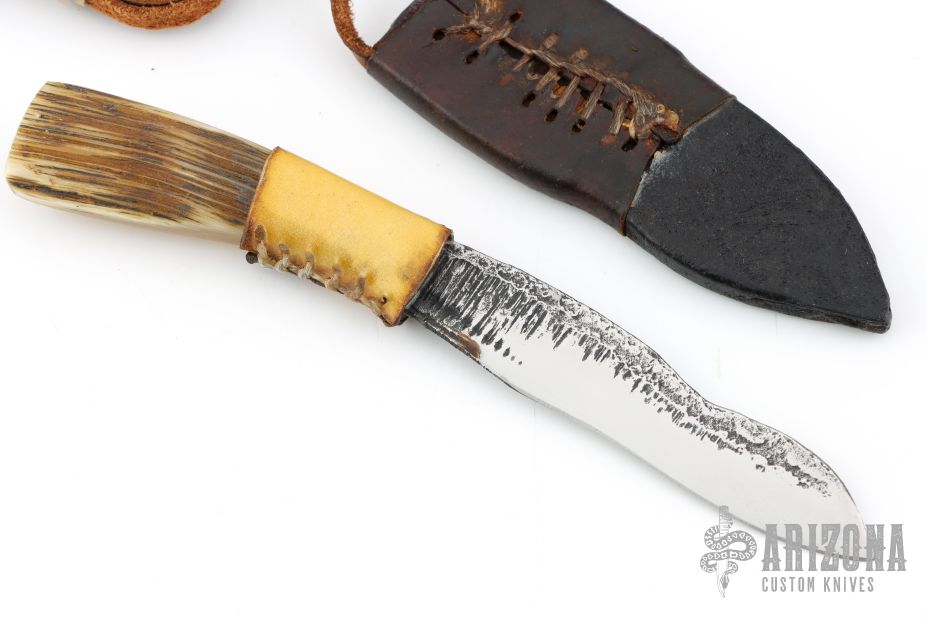 This knife by RB Johnson features a satin finished blade with hammer finished flats, .092" blade stock and .784" blade depth, hidden tang construction. The handle has leather wrapped oosic grip. Comes with a leather sheath. Has some light scratches, excellent condition otherwise.