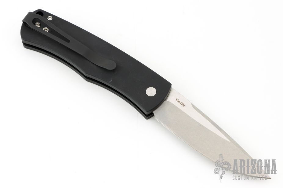 This Magic BR-1 Bolster Release Automatic from Pro-Tech Knives features a drop point stonewashed 154-CM blade with swedge. The handle features a black aluminum frame with checkered bolster and ivory paper micarta inlay on the "A" side of the handle. Black coated stainless steel clip is positioned for tip up carry. Lanyard hole in the pommel. Comes with original box and papers. Excellent condition.