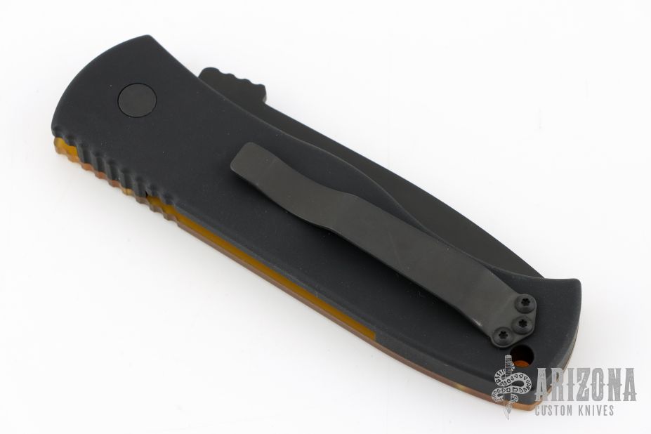 This Emerson/Pro-Tech CQC7 automatic has a chisel ground black blade with a plain edge and an Ultem and black aluminum handle with a satin push button.  Black stainless steel clip. Coil spring. Comes with original box and papers. Excellent condition.