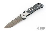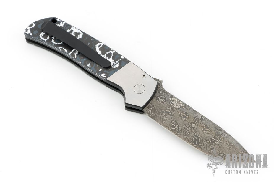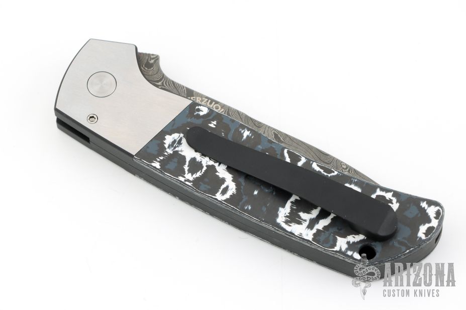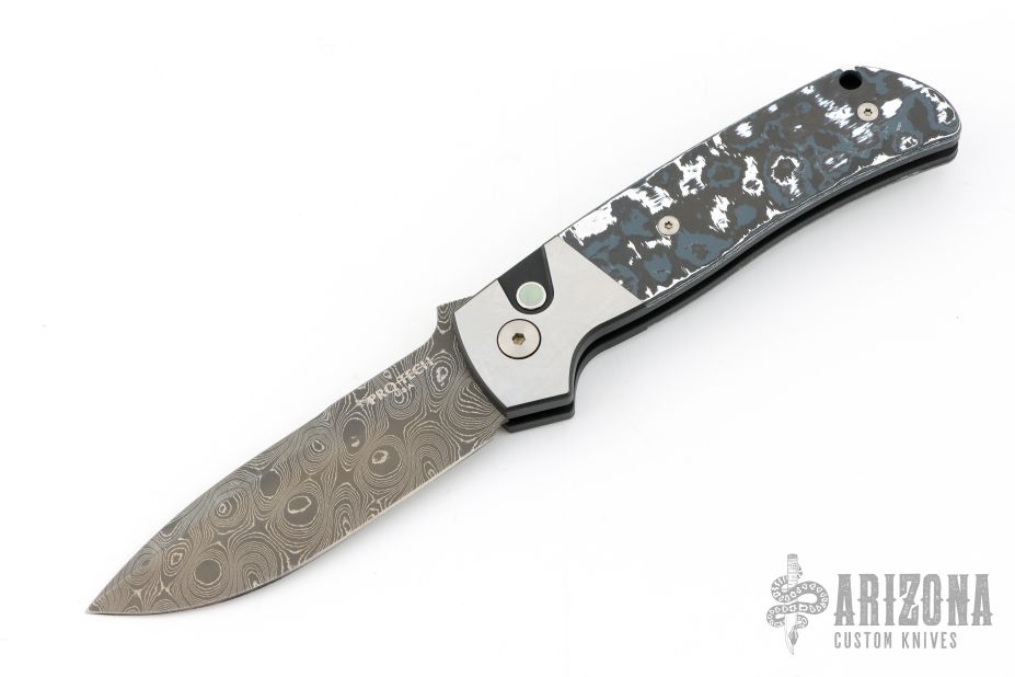 This ATCF Auto by Pro-Tech features a Chad Nichols Stainless Damascus blade with notched thumbrest. The handle has a 416 SS frame with White Storm scales, pearl inlaid push button, tip up milled titanium clip with hidden screws and DLC finish. Comes with original box, deluxe wood box, papers and drawstring pouch. Excellent condition.