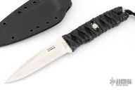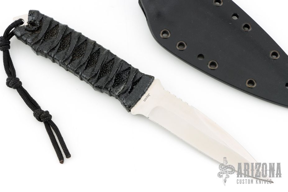 This RJ Martin designed FB11P Kumo Fixed Blade has a satin finished VG-10 drop/ spear point blade with false top edge and notched spine. .098" blade stock, .909" depth. Handle is Japanese wrapped over stingray skin and Spyderco spider logo stainless steel underlay. Exposed tang butt/ glass breaker has lanyard hole. Excellent condition. Comes with original box, papers, and Kydex sheath. Has some scuffs otherwise excellent condition.