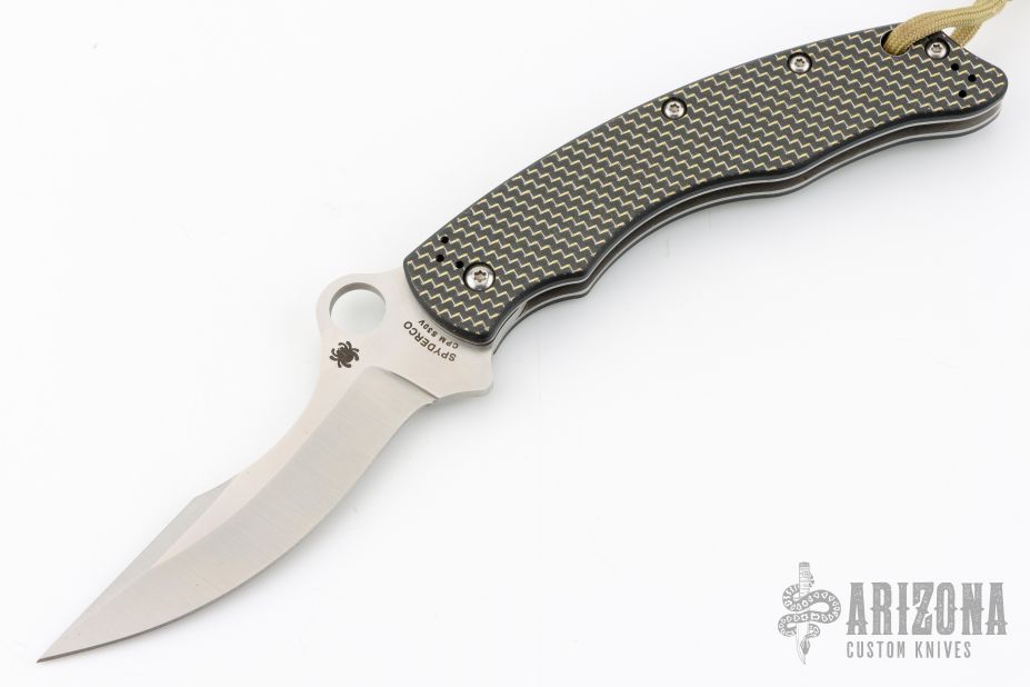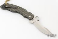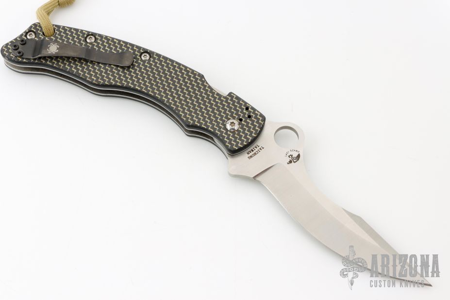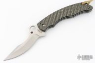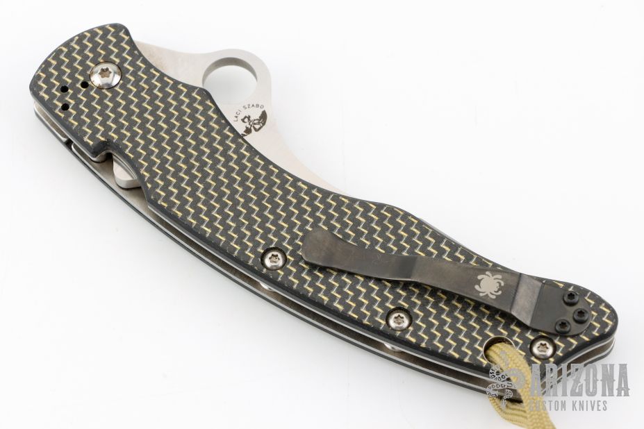This C146CFP Szabo Folder from Spyderco features a satin finish clip point blade with swedge and thumb hole. The handle is comprised of gold line carbon fiber/G10 laminate scales over steel liners and barrel spacers. Black coated 4 way adjustable pocket clip. Lanyard tube in pommel. Comes with original box. Blade rubs the frame. Excellent condition.
