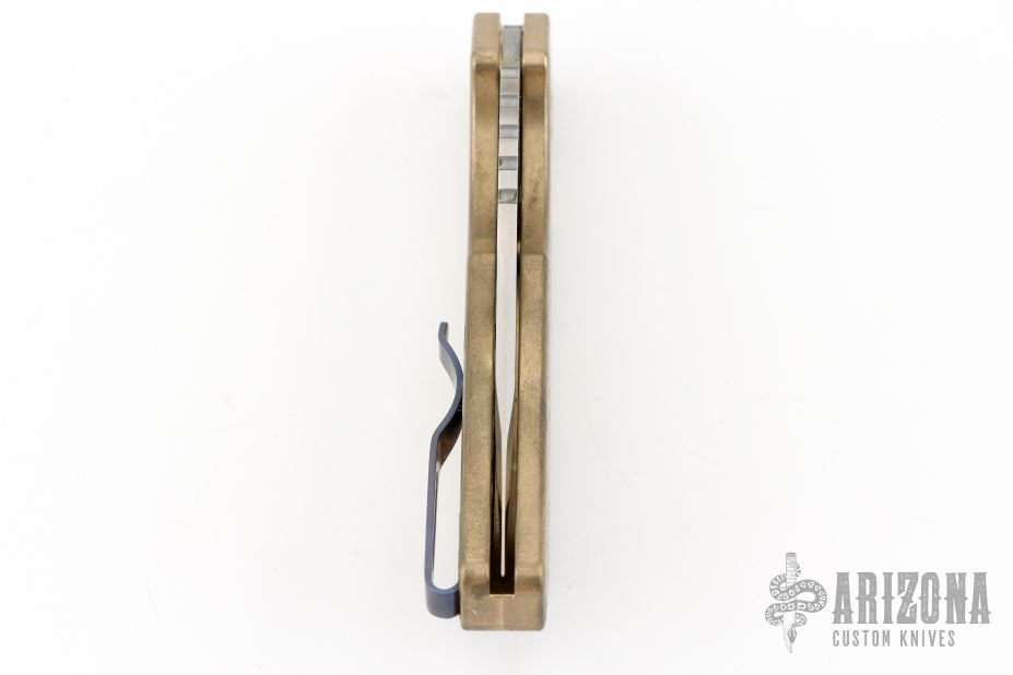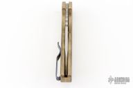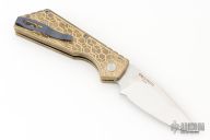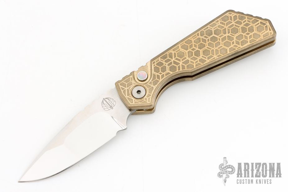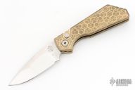 This Pro-Strider PT by Pro-Tech and Strider Knives features a Mike Irie hand ground and mirror finished blade with notched thumbrest. The handle has a tumbled and milled aluminum bronze frame with anodized titanium tip up clip, black lip pearl button. Includes the original box, wooden box and papers. Excellent Condition.  #12 of 30