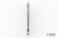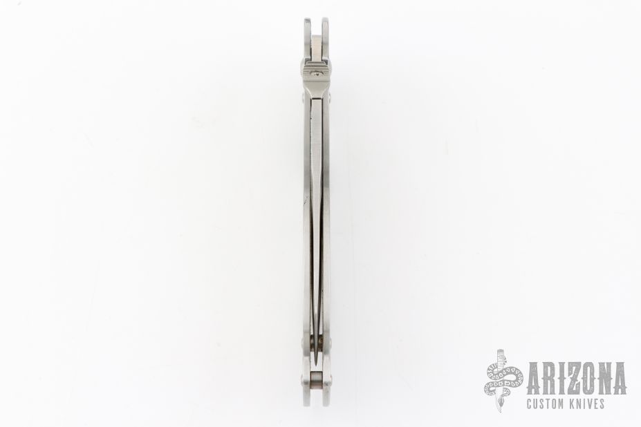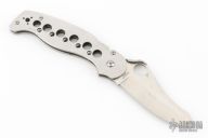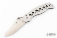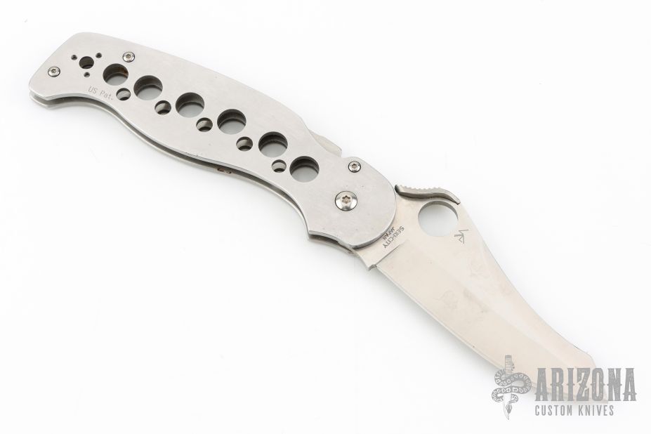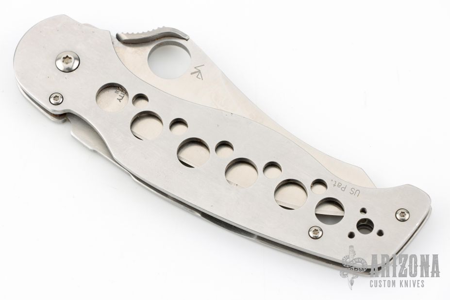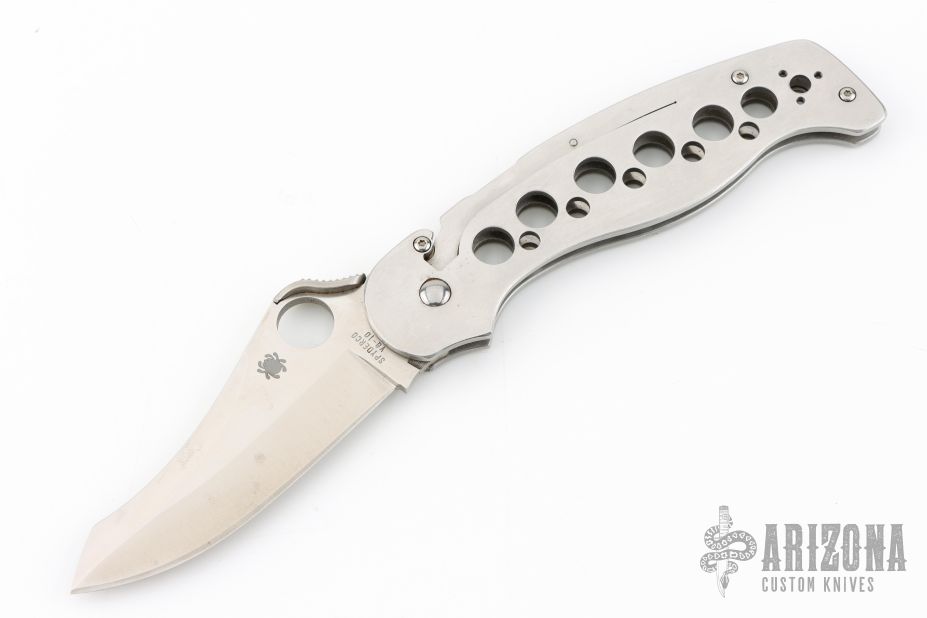This C70P ATR by Spyderco Knives features a satin finished spearpoint blade with thumbhole and notched thumbrest. The handle is satin finished steel and has a top framelock. Right or Left tip up stainless steel clip. Comes with original Spyderco box. Has scuffs and scratches throughout. Fair condition; good user condition otherwise.
