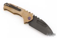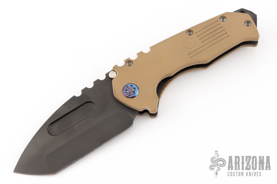 The Production Praetorian Scout is every bit as superb as other Medford knives. You'll enjoy the powerful MKT design in a lightweight EDC-friendly package with a full-sized blade complete with standard no-bull spine texture, a wide thumb groove opener, and a matte bead blast/stonewash finish. Its handle is outfitted with a resilient titanium liner lock and durable, textured black G-10 slabs machined with the Betsy Ross US flag and the Medford logo. A smooth patch under the stamped titanium clip has been included for frustration-free pocket carry. Features: D2 tool steel blade for top-notch wear resistance and performance. Textured G-10 handle offers a solid, no-slip grip in all conditions. Smooth handle surface beneath the titanium pocket clip allows easy pocket carry without the wear and tear. Bronze hardware and clip. Comes with original box, papers dated August 15 2023, and zippered case. Excellent condition.