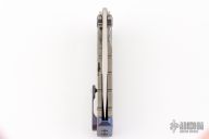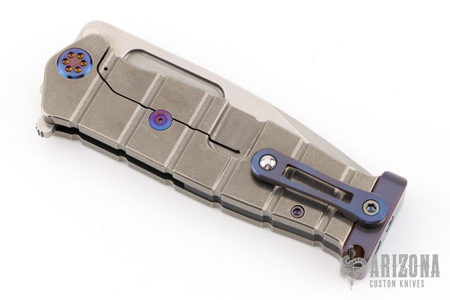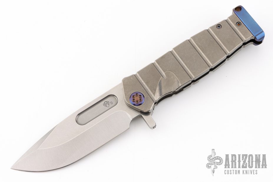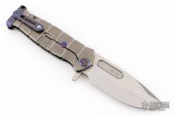 This USMC Fighter Flipper by Medford features a satin finished drop point blade with a fuller and a notched flipper tab.  The handle features a tumbled titanium frame with anodized ascents with a matching tip up titanium clip.  Includes the original box, hard case and papers dated January 25, 2022. Excellent condition.