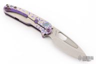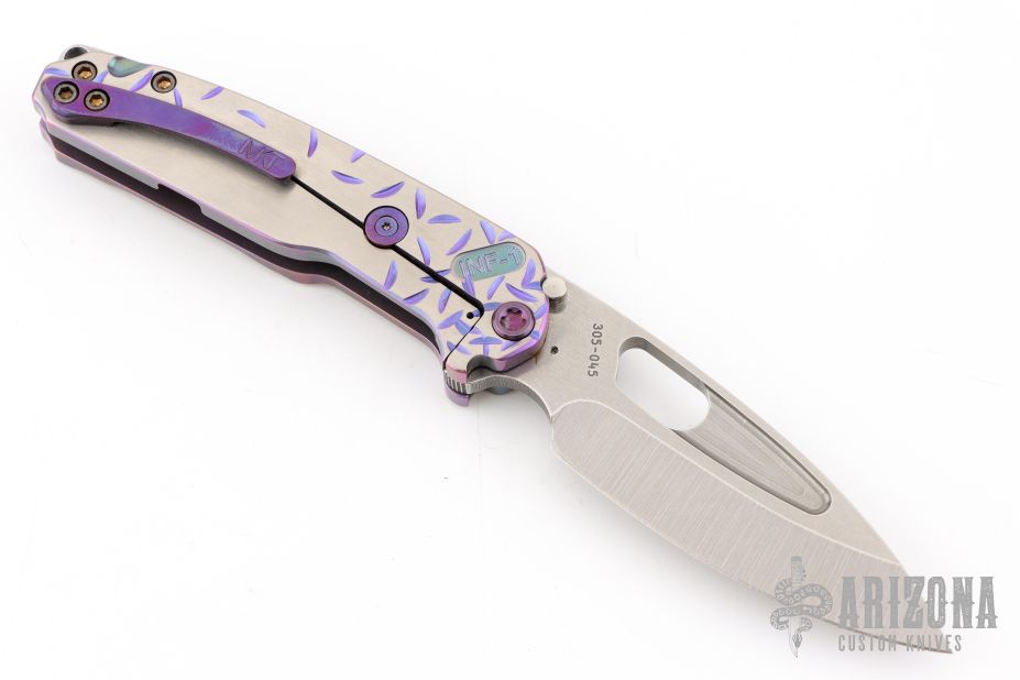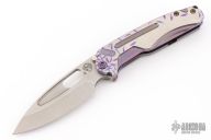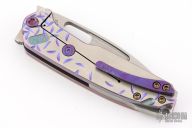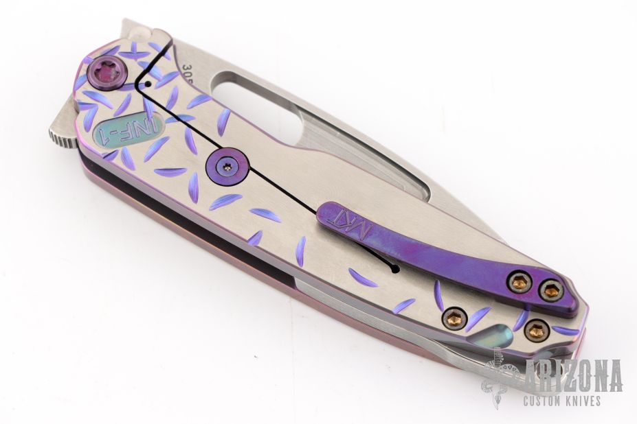 The all Titanium Infraction, by Medford Knife and Tool features a satin finished drop point blade with a recess and oversized thumb hole. The handle is composed of anodized titanium. The tip up carry pocket clip is composed of anodized titanium.  Nice detent, lockup and blade seating. Excellent condition. Comes with original box, hard case and COA dated August 29, 2023.