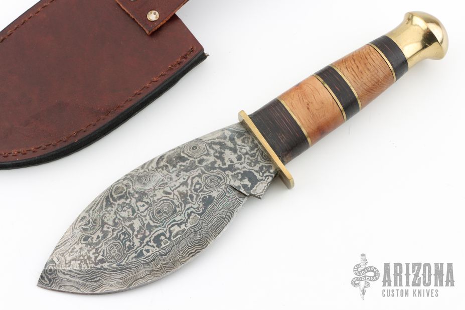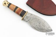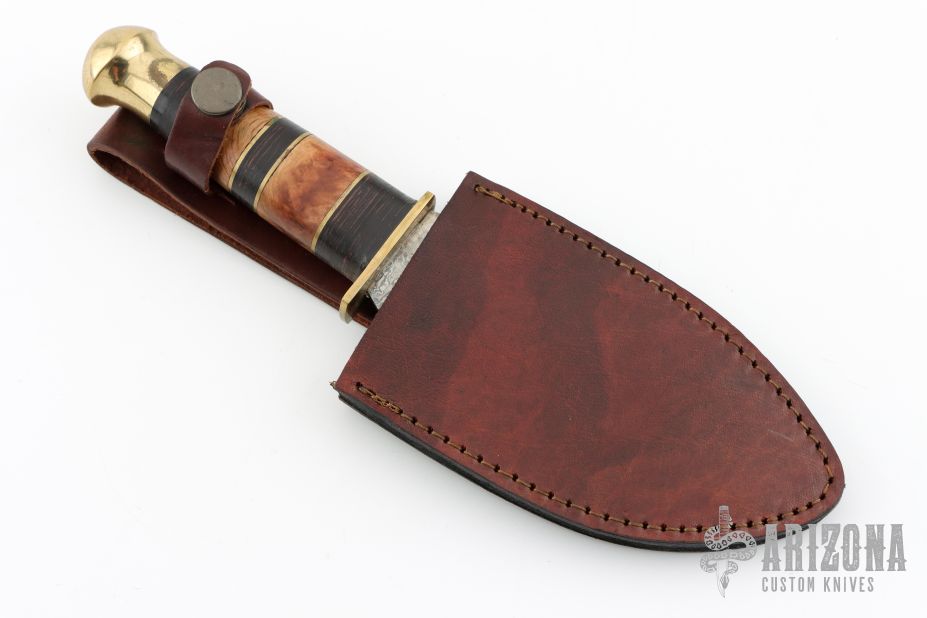 This knife has a Damascus blade with .138" blade stock and 2.242" blade depth, hidden tang construction. The handle has a brass guard and butt with stacked wood and brass spacers. Comes with a brown leather sheath. Has a small gap in the handle, otherwise excellent condition.