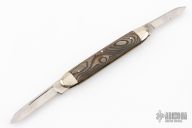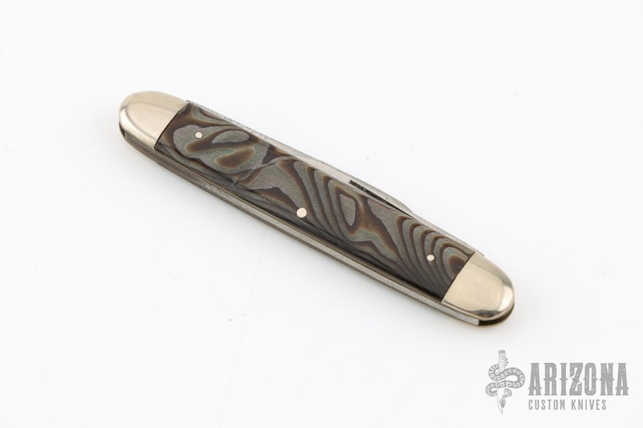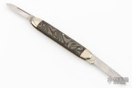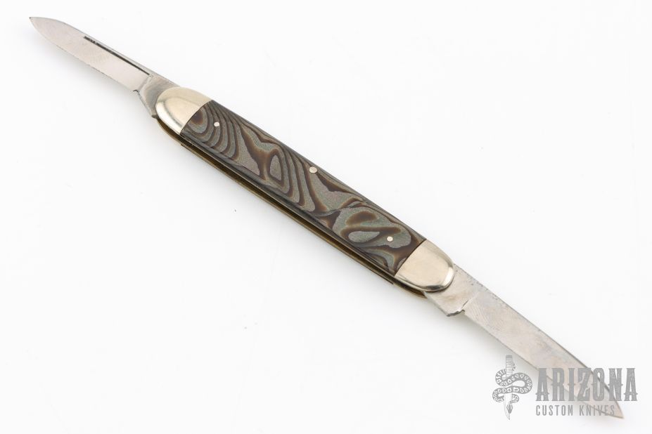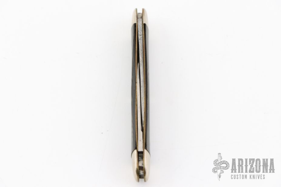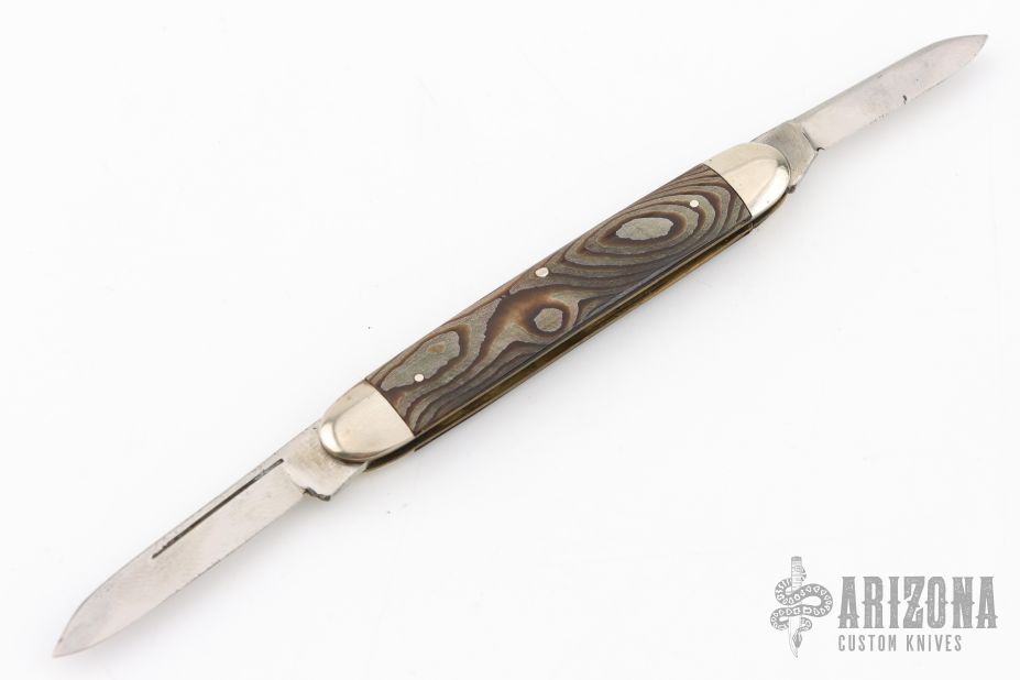 This Slipjoint by Aerial AC Mfg Co features a satin finished clip point blades with nail nicks. The handle has nickel silver bolsters, front and rear, brown and silver celluloid covers with brass liners, steel backspacer. Has some scratches and and light oxidation, otherwise good condition for its age.