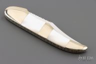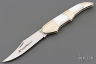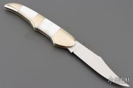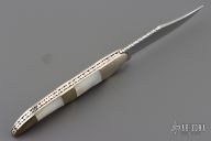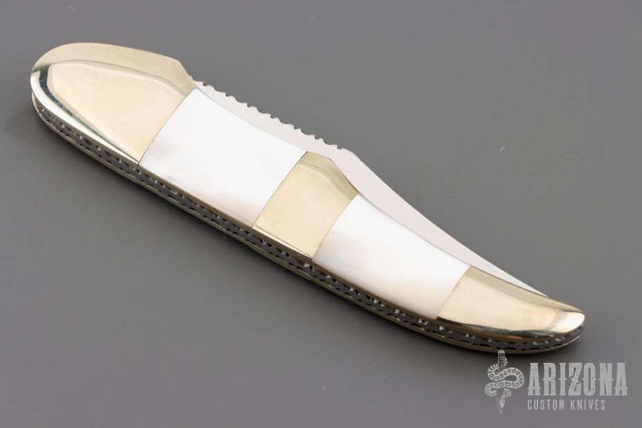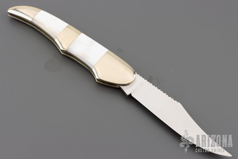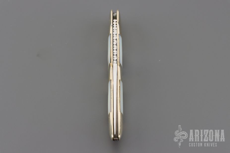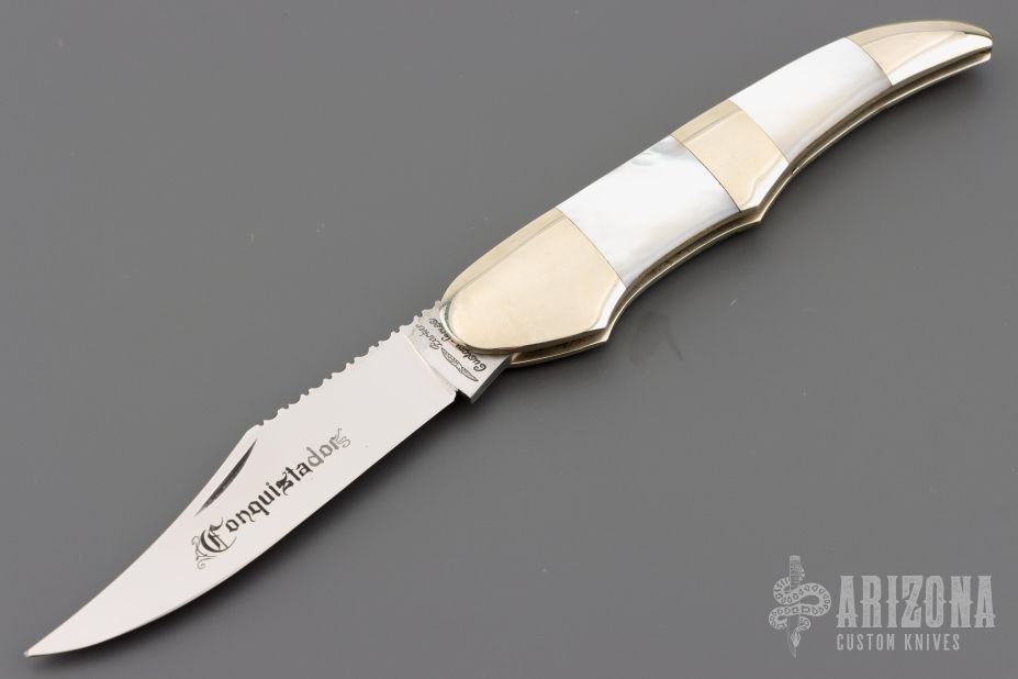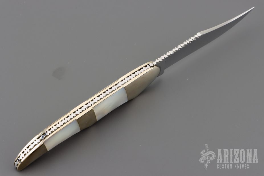 This slipjoint by Parker Custom Series has a mirror polished blade with nail nick and fileworked spine. Nickel silver scales with mother of pearl inalys, fileworked stainless steel spring. Excellent condition. Made in Japan. Comes with a cloth pouch.