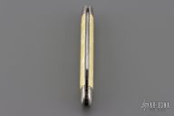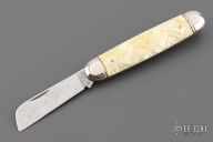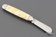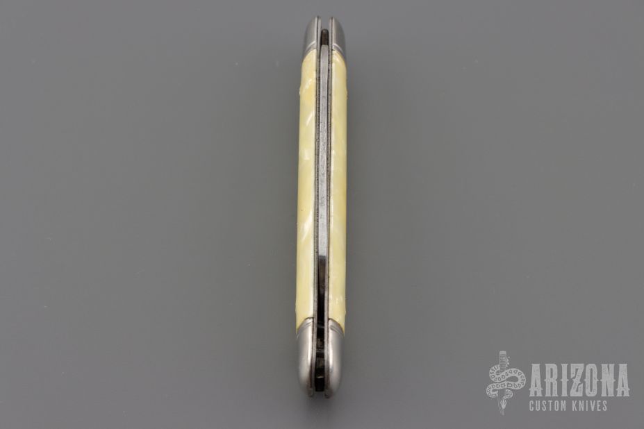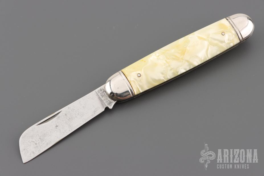This knife by Imperial has a satin finished blade with nail nick. The handle has fluted steel bolsters, Celluloid covers, steel liners, steel spring. Has half-stop. Has some light scratches and patina, otherwise good condition for its age.