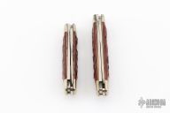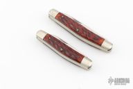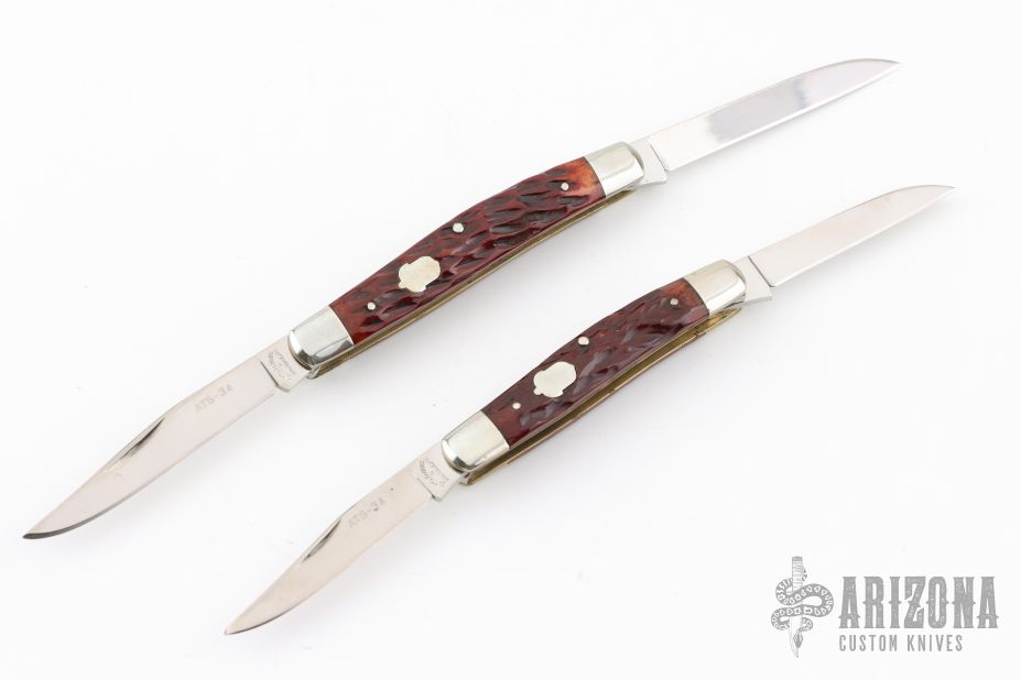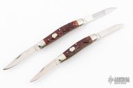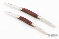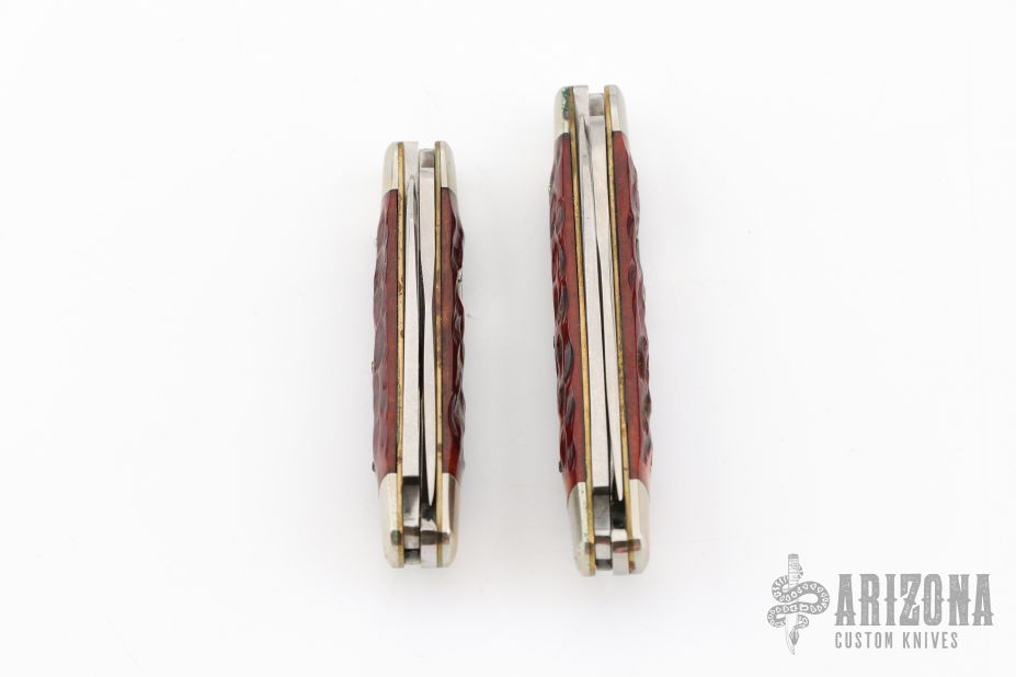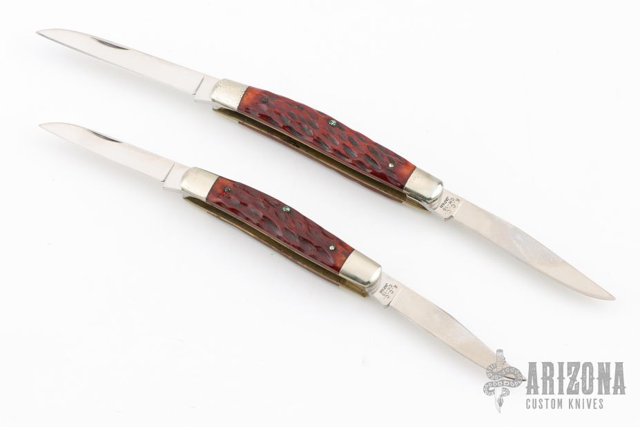 This set of CM-16 and CM-15 Hawbaker Muskrat pattern slipjoint from Cattaragus Knives features two polished blades with nail nicks. The handle has nickel silver double bolsters and escutcheon and jigged bone covers over brass liners and stainless steel backsprings.  Includes original box. Has some light scratches and some spots on the bolsters, otherwise good condition.