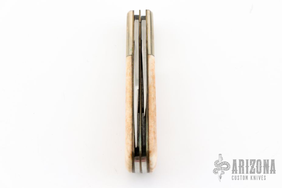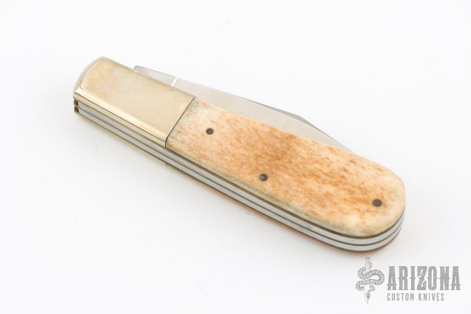 This slipjoint by Parker Cutlery Company features satin finished blades with nail nicks. The handle has nickel silver bolsters, bone covers, brass liners, steel springs. Has some light scratches, otherwise excellent condition. Comes with original box.