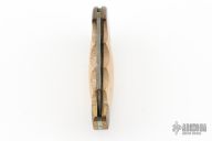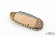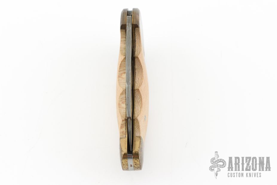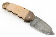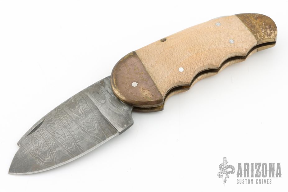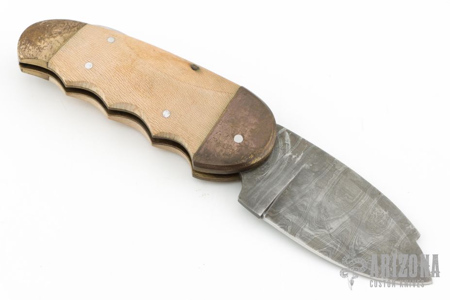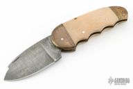 This lockback features a Damascus blade with nail nick. The handle has brass bolsters, wood scales, brass liners and steel spring. Comes with a brown leather sheath. Has scratches, patina, wear on the Damascus finish, fair condition.