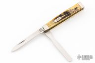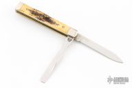This Baby Doctors Knife slip joint by Case Knives features a drop point blade with nail nick and spatula blade with nail nick. The handle has nickel silver double bolsters, brass liners, stag covers, brass liners and stainless springs. Comes with original box and papers. Excellent condition.