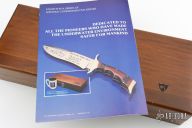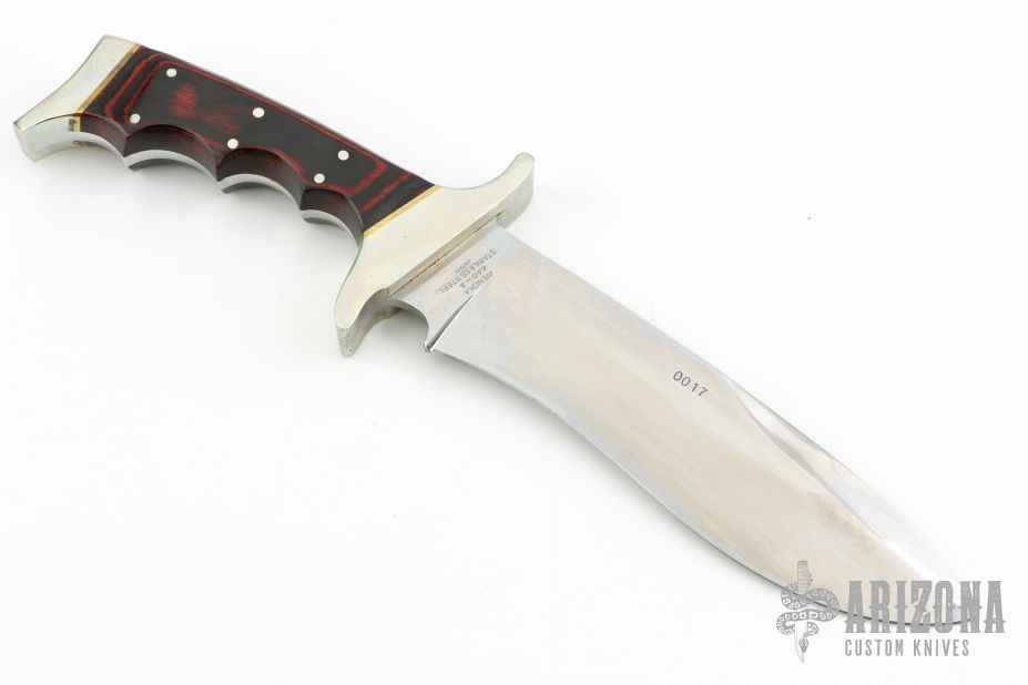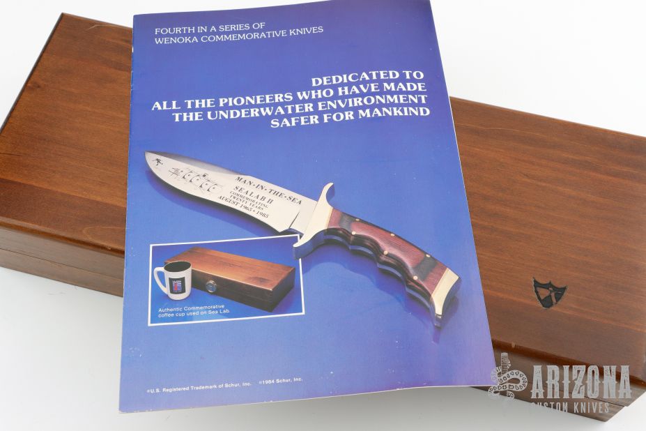 This Bowie by Wenoka cutlery features a mirror polished blade with a top edge, .215" blade stock and 1.8" blade depth, full tang construction. The handle has a nickel silver guard and butt with a pinned wood grip. Comes with felt lined wooden display box and paperwork. The cushion inside of the display box is crumbling. Has some light scratches and patina. Great condition for its age, and otherwise. #0017 on the blade.