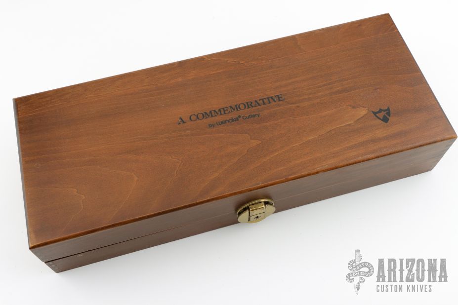 This Bowie by Wenoka cutlery features a mirror polished blade with a serrated top edge, .233" blade stock and 1.362" blade depth, hidden tang construction. The handle has a nickel silver guard and butt with a wood grip. Comes with felt lined wooden display box. The cushion inside of the display box is crumbling. Has some light scratches and patina. Great condition for its age, and otherwise. #0035 on the blade.