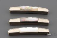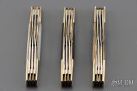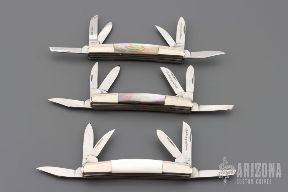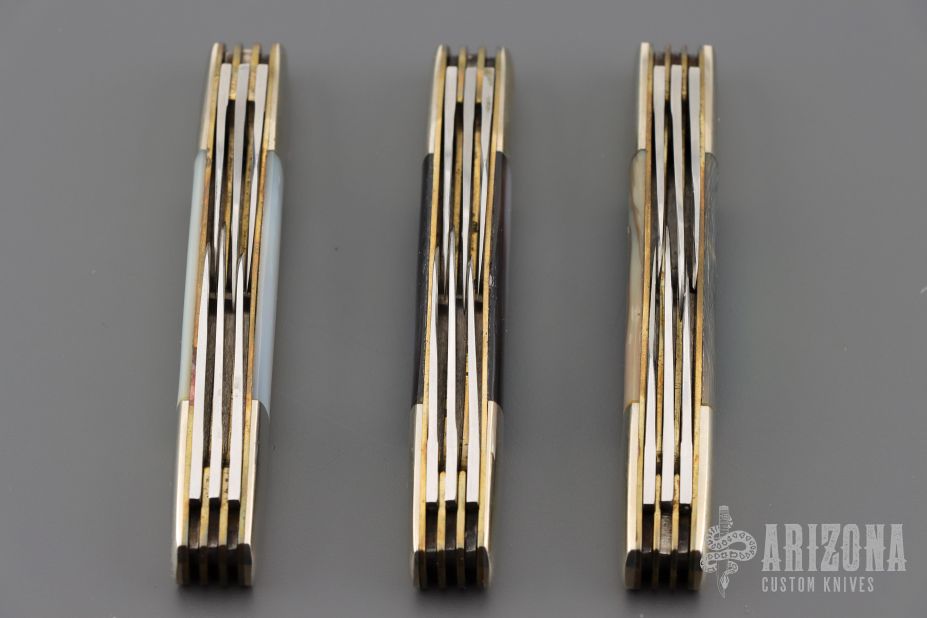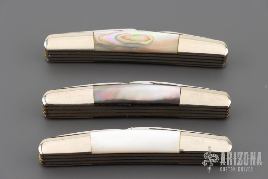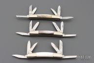 This Trapper by Case knives features mirror polished blades with nail nicks. The handle has nickel silver bolsters, black/silver acrylic covers, brass liners and stainless springs. Comes in a Case box. Excellent condition.