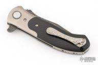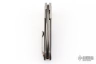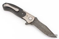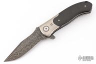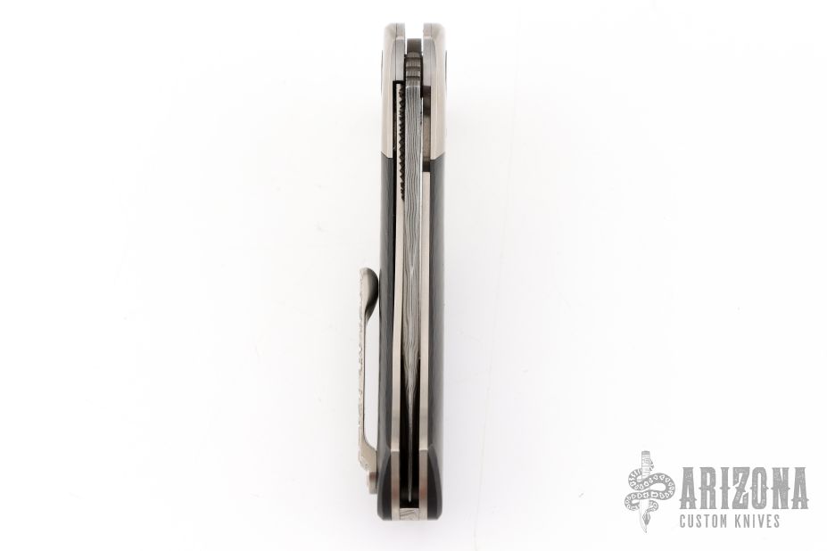 This Deluge Linerlock Flipper by DB Fraley features a Damascus recurve blade with false top edge, notched thumb rest and flipper tab. The handle has satin finished titanium bolsters, Damascus pivot collars, carbon fiber covers, "Lost Skulls" carved/file-worked backspacer, matching tip up clip and lanyard hole at the butt. Comes with a leather slip case. New from maker!
