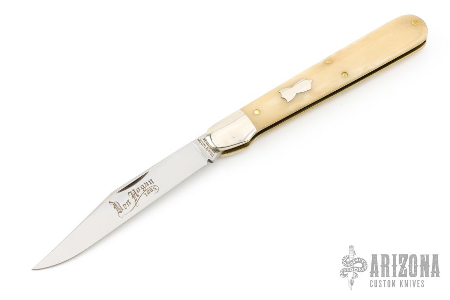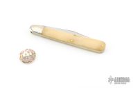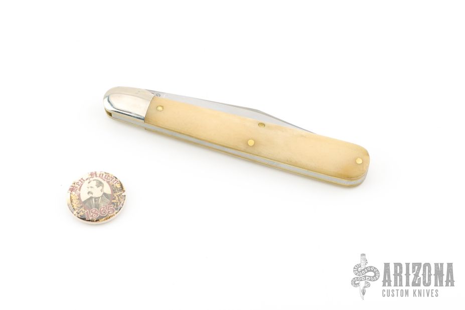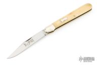 This knife by Great Eastern Cutlery features a polished finished blade with a single nail nick. The handle has nickel silver bolsters, escutcheon and brass liners, smooth white bone covers. Has half-stop. Comes with original tube, wax paper, and button. Has some light scratches, otherwise excellent condition.
