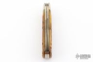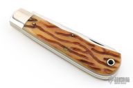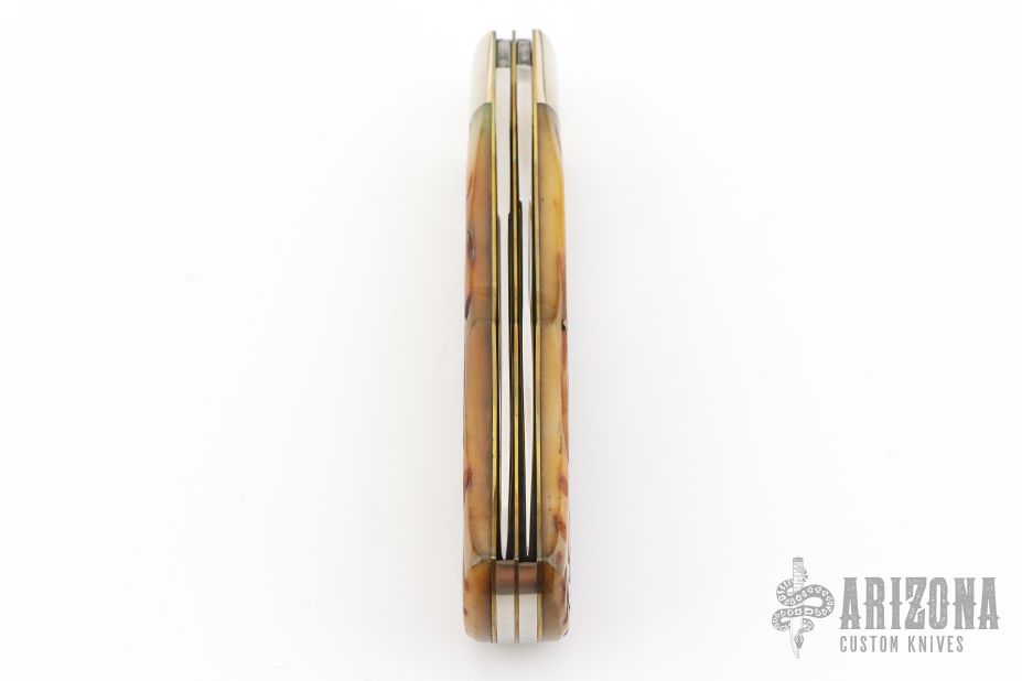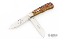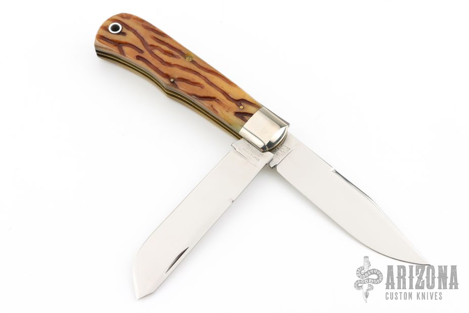 This knife by Schatt & Morgan features mirror polished drop point blades with nail nicks.  The handle has nickel silver bolsters, jigged bone covers over brass liners with steel springs. Comes with original box. Dated 2007. Excellent Condition.