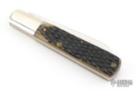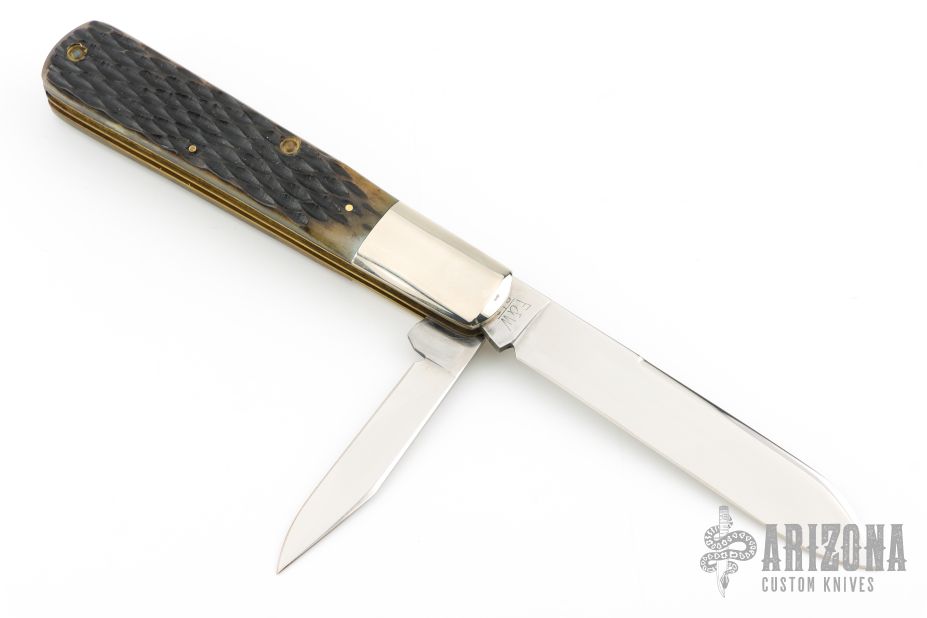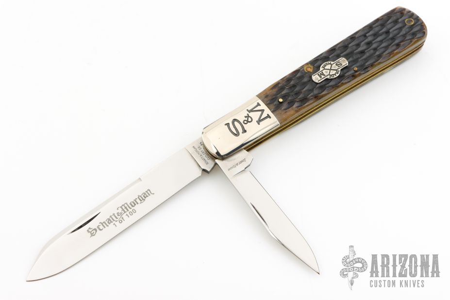 This 2-Blade Daddy Barlow by Schatt & Morgan features polished blades with nail nicks. The handle has nickel silver bolsters, jigged bone covers, brass liners and stainless steel springs. Has half-stops. Comes with original box (marked red bone not green) and paper. Excellent condition.