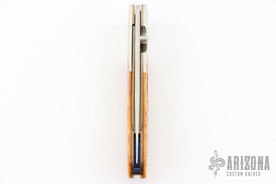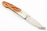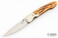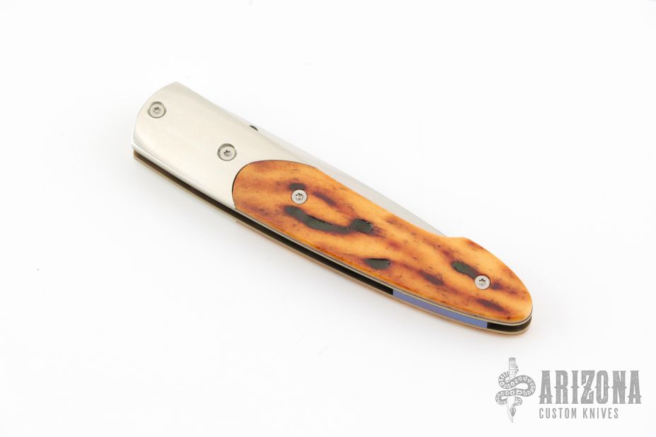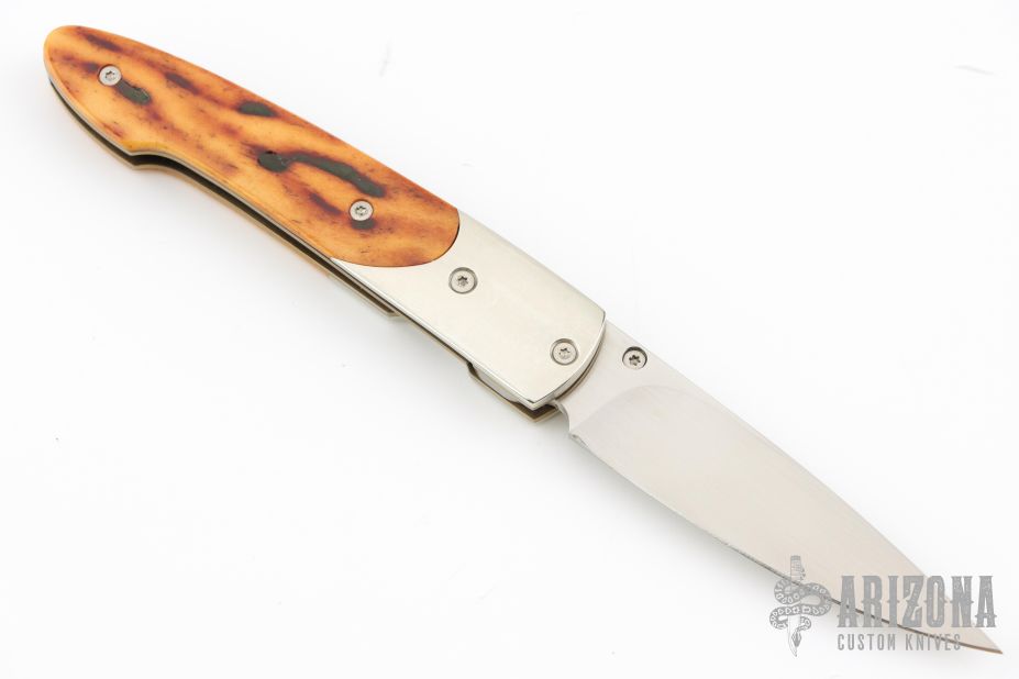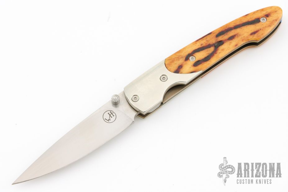 This T-10 folding knife from William Henry features a hand rub satin finished blade, stainless bolsters, and jigged bone scales, anodized titanium liners and backspacer. Comes with WH leather slip. Has a couple light scratches, excellent condition.