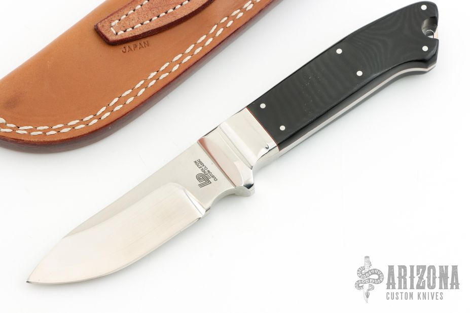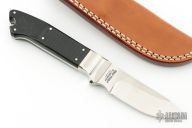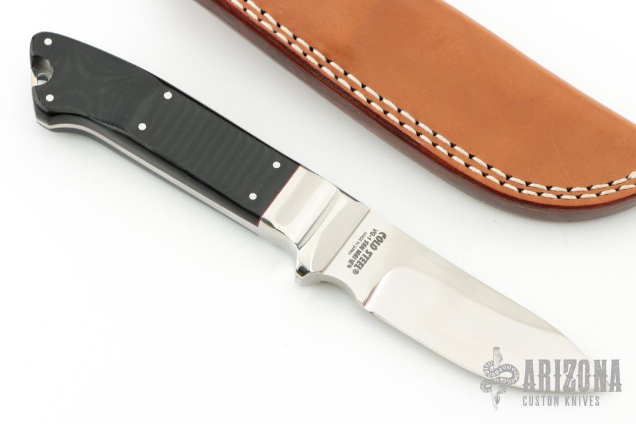 This knife by Cold Steel is a Lloyd Pendleton design, it features a satin finished San Mai blade, .186" blade stock and 1.083" blade depth, full tapered tang construction. The handle has polished stainless steel bolsters, black linen micarta scale with red liners/spacers, lanyard hole at the butt. Comes with brown leather sheath. Excellent Condition.