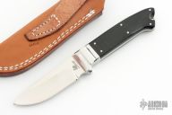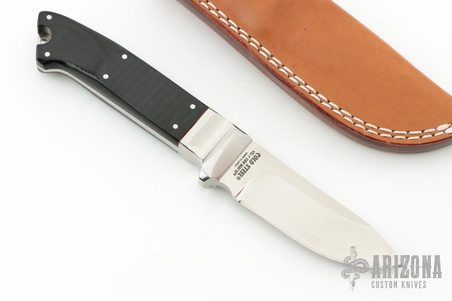 This knife by Cold Steel is a Lloyd Pendleton design, it features a satin finished San Mai blade, .186" blade stock and 1.083" blade depth, full tapered tang construction. The handle has polished stainless steel bolsters, black linen micarta scale with red liners/spacers, lanyard hole at the butt. Comes with brown leather sheath. Excellent Condition.