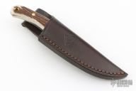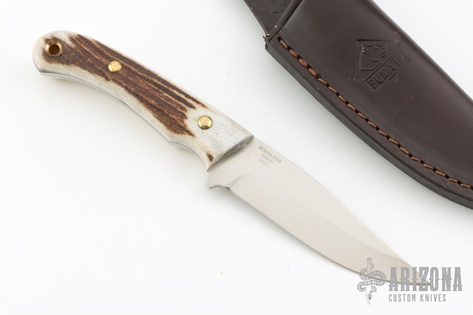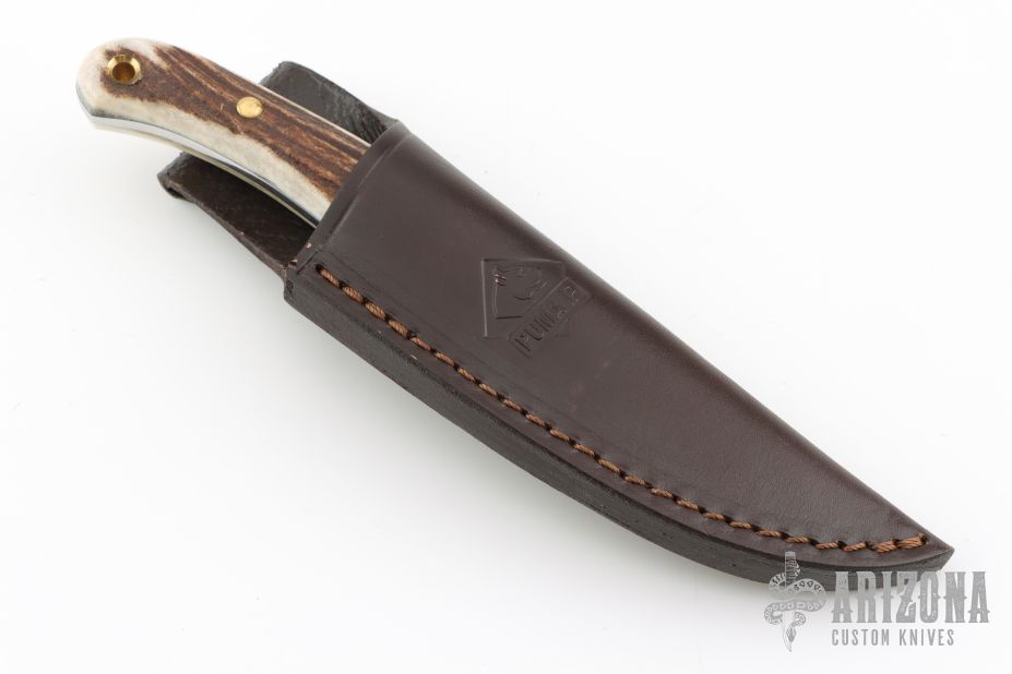This knife by Puma features a clip point blade with 1.21" blade stock, 1.060" blade depth, and full tang construction. Handmade by skilled craftsmen with stag scales and lanyard hole in pommel. Comes with original brown leather sheath and box/papers. Excellent condition.