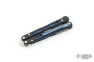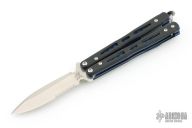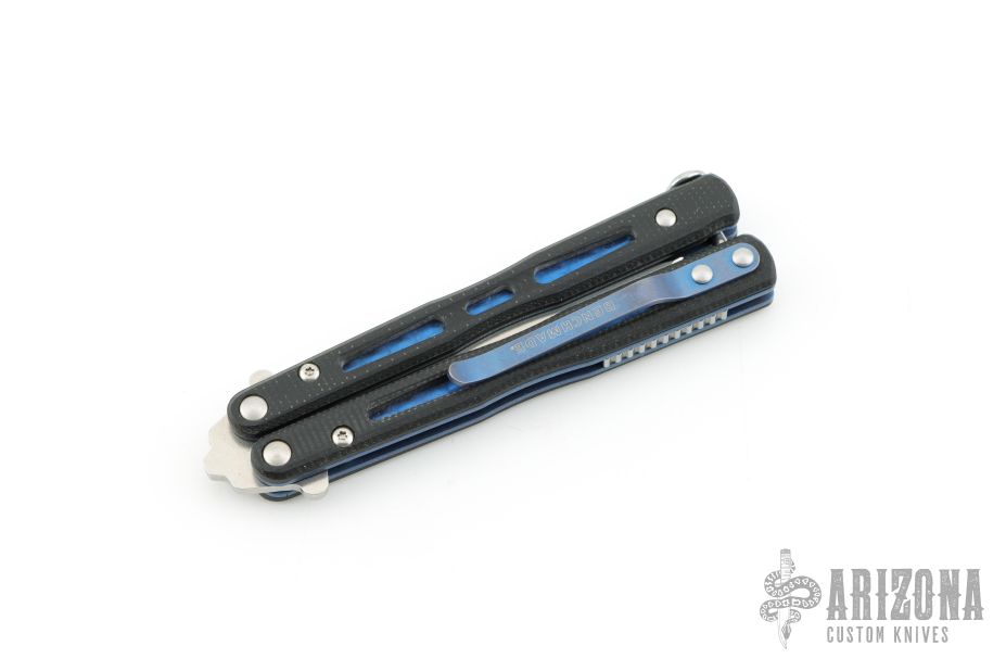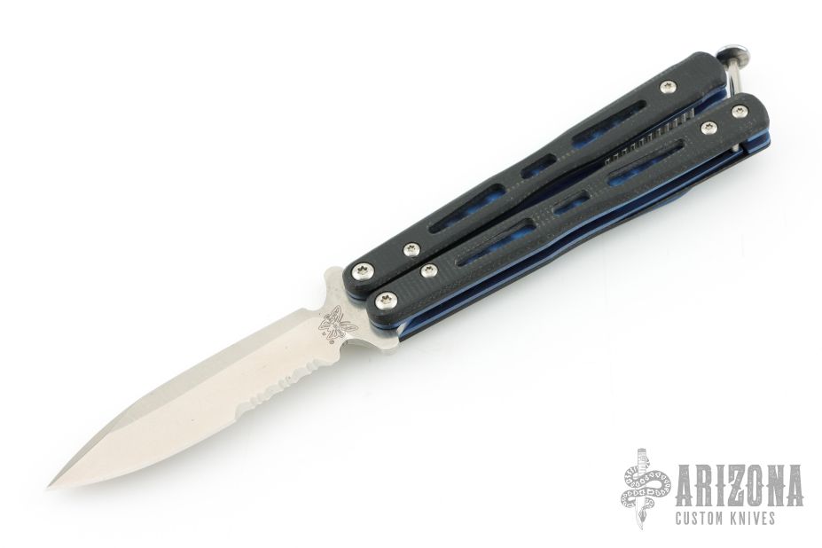 This Model 32 Morpho Balisong by Benchmade has a stonewashed spear point partially serrated blade. Handle is black G-10 with blue anodized titanium liners and milled stainless steel spacers. Blue anodized titanium tip up clip. Comes with original box, pouch, and papers. Has a couple light scuffs on the clip, otherwise Excellent condition.
